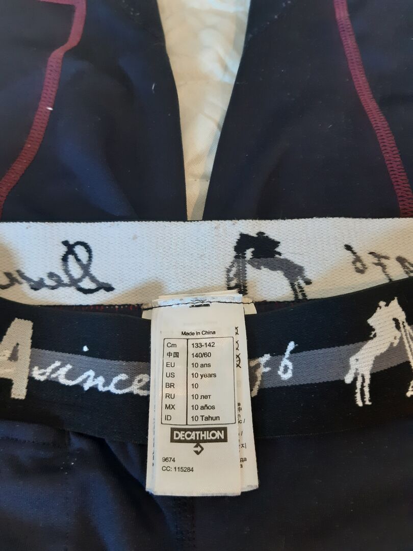 Bryczesy dziecięce - Bryczesy letnie, ciemnoniebieskie z kontrastowymi szwami i polami w kolorze miętowym/różowym, 2 kieszenie tylne, 1 kieszeń przednia prawa.