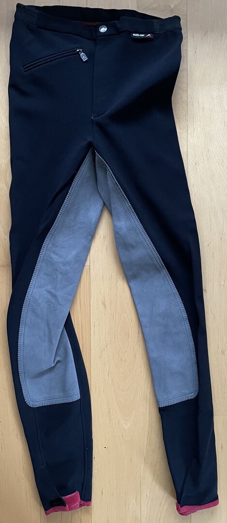 Bryczesy dziecięce Euro-Star, letnie, czarne, rozmiar ok. 176 - Sprzedam parę klasycznych bryczesów dziecięcych w bardzo dobrym stanie firmy Euro-Star z szarymi wykończeniami 3/4 ze skóry syntetycznej w kolorze czarnym. Niestety rozmiar nie jest już czytelny, prawdopodobnie jest to rozmiar 176. Klasyczny, lekki, letni prążkowany materiał jest elastyczny, nogawki mają zapięcie na rzep, a z przodu po prawej stronie znajduje się mała kieszonka na zamek. Z boku pasa znajdują się elastyczne elementy. Idealne dla wysokich, szczupłych dziewcząt. Wymiary (nierozciągnięte): Wewnętrzny pas (zamknięty, pojedynczy): ok. 34 cm Wewnętrzna długość nogawki (od kroku do paska): ok. 76 cm Zewnętrzna długość nogawki (od pasa do mankietów): ok. 102 cm