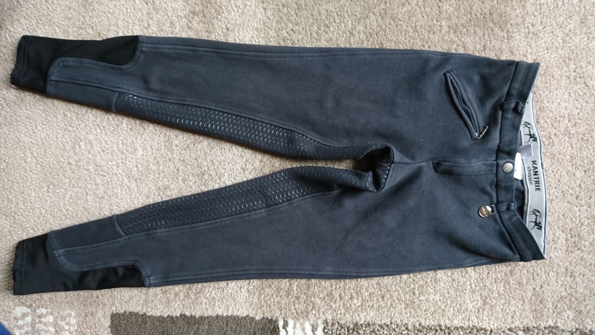 Bryczesy dziecięce Kantrie, pełne siedzenie, 170 - Niestety, z ciężkim sercem i ze względów zdrowotnych musimy zrezygnować z naszego hobby. Dlatego oferujemy parę dobrych bryczesów dziecięcych w rozmiarze 170, które nie były zbyt często noszone. Są one produkowane przez firmę Kantrie. Z przodu mają małą kieszonkę. Całe siedzisko jest nieuszkodzone. Są one bardzo wygodne i przyjemne w noszeniu. Nie ma dziur, plam ani innych uszkodzeń.