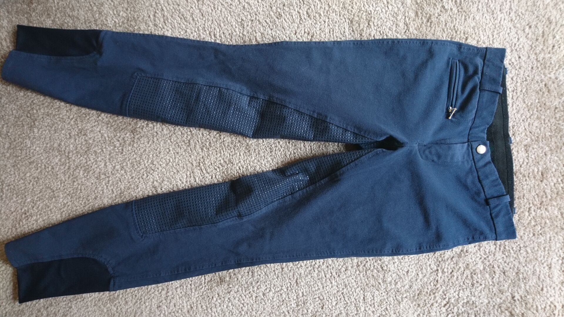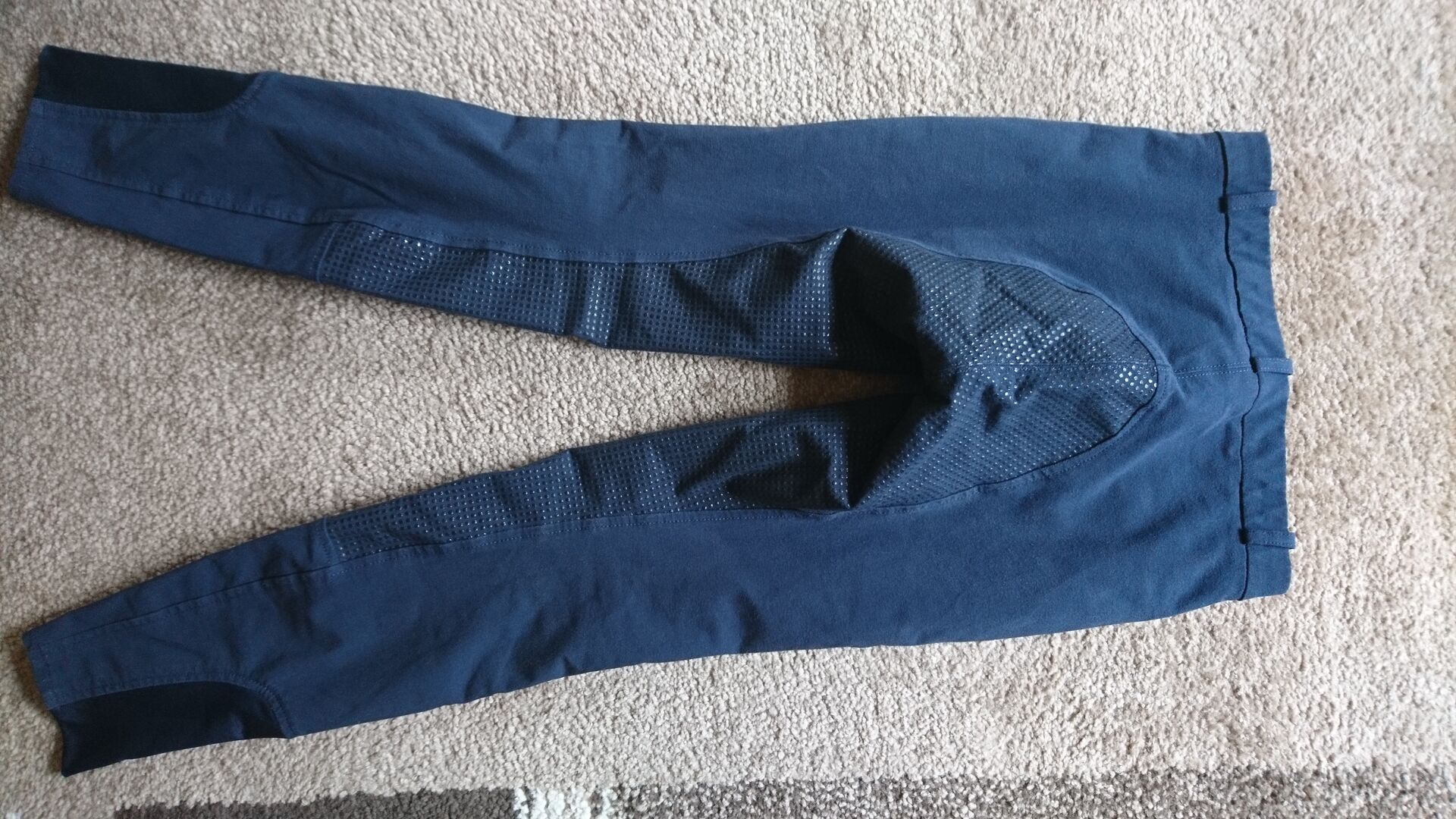 Bryczesy dziecięce, pełne siedzenie, 158 - Niestety, z ciężkim sercem i ze względów zdrowotnych musimy zrezygnować z naszego hobby. W związku z tym oferujemy parę mało używanych, granatowych bryczesów dziecięcych w rozmiarze 158. Są one produkowane przez firmę Equiva. Z przodu mają małą kieszonkę. Całe siedzisko jest nieuszkodzone. Są one bardzo wygodne i przyjemne w noszeniu. Nie ma dziur, plam ani innych uszkodzeń.