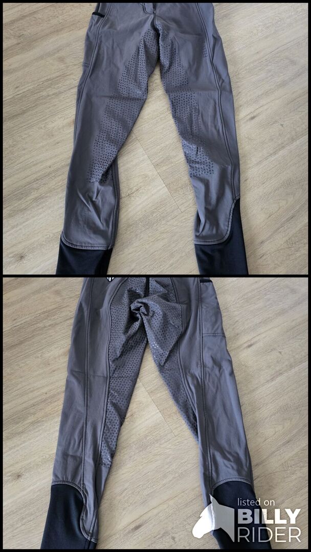 Bryczesy Felix Bühler z pełnym siedziskiem + kieszonka na telefon komórkowy - Silikonowe bryczesy z pełnym siedziskiem i elastycznymi mankietami na nogawkach + kieszeń na telefon komórkowy, szare, rozmiar 34, rzadko noszone.