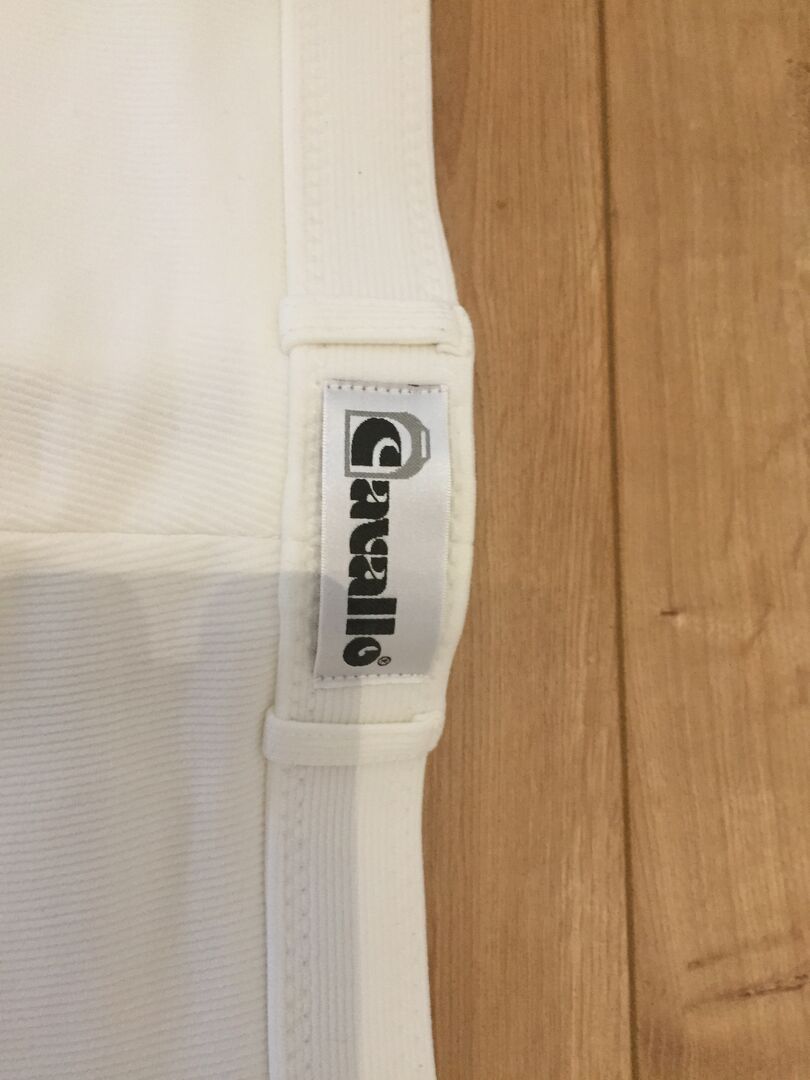 Bryczesy jeździeckie białe rozmiar 182 - Bryczesy były noszone tylko 3 razy i to na polowaniu na lisy, stąd lekkie rozpryski błota w kroku, mają również przebarwienia ze skóry, które widać na zdjęciach. Przy odrobinie umiejętności można usunąć plamy.