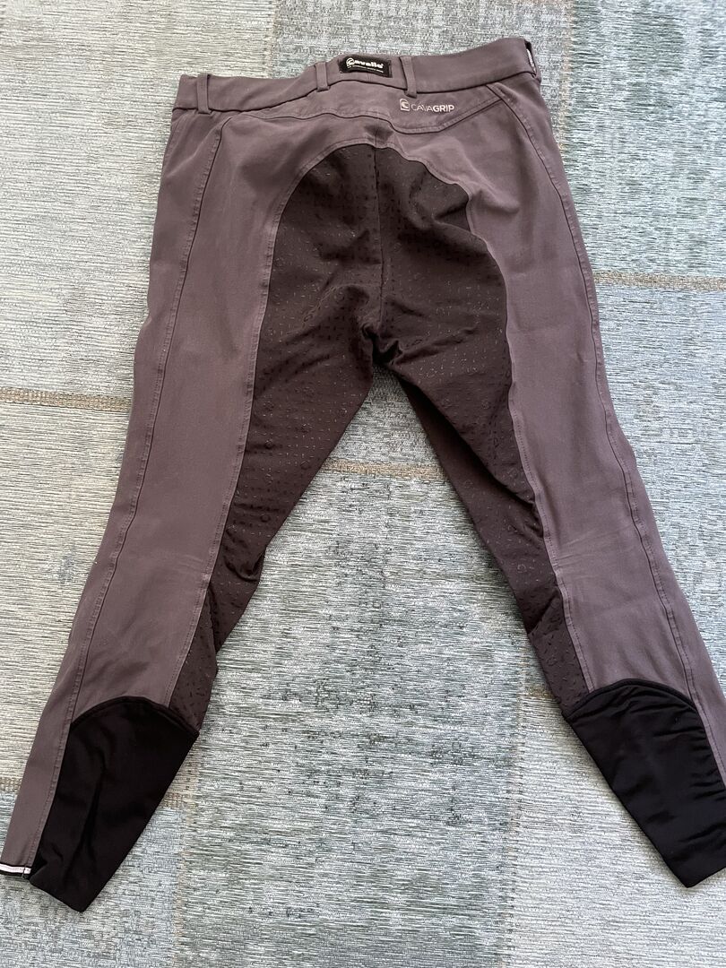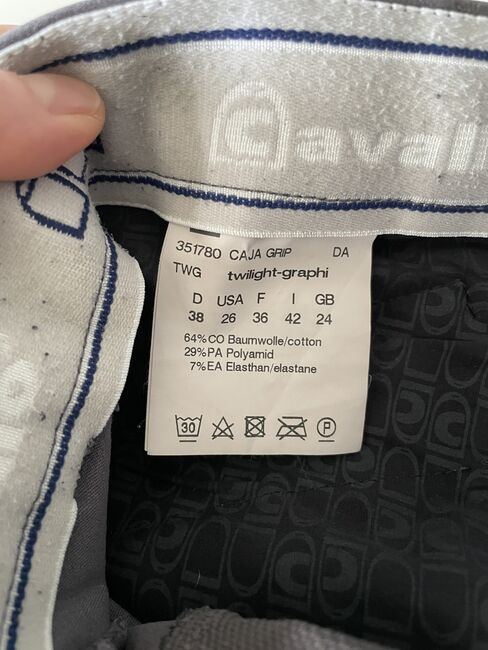 Bryczesy jeździeckie Cavallo Caja Grip 38 M - Na sprzedaż używane bryczesy jeździeckie marki Cavallo (model Caja Grip), kolor Graphite/Twilight, rozmiar 38.