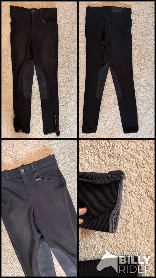Bryczesy jeździeckie Covalliero czarne rozmiar 152 częściowe siedzisko - Spodnie są w dobrym stanie, ale rąbek na obu nogawkach jest pełen dziur, patrz zdjęcia. Poza tym spodnie są naprawdę w dobrym stanie.