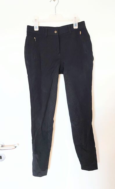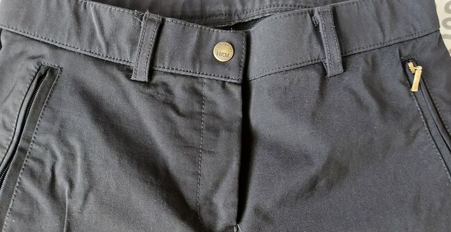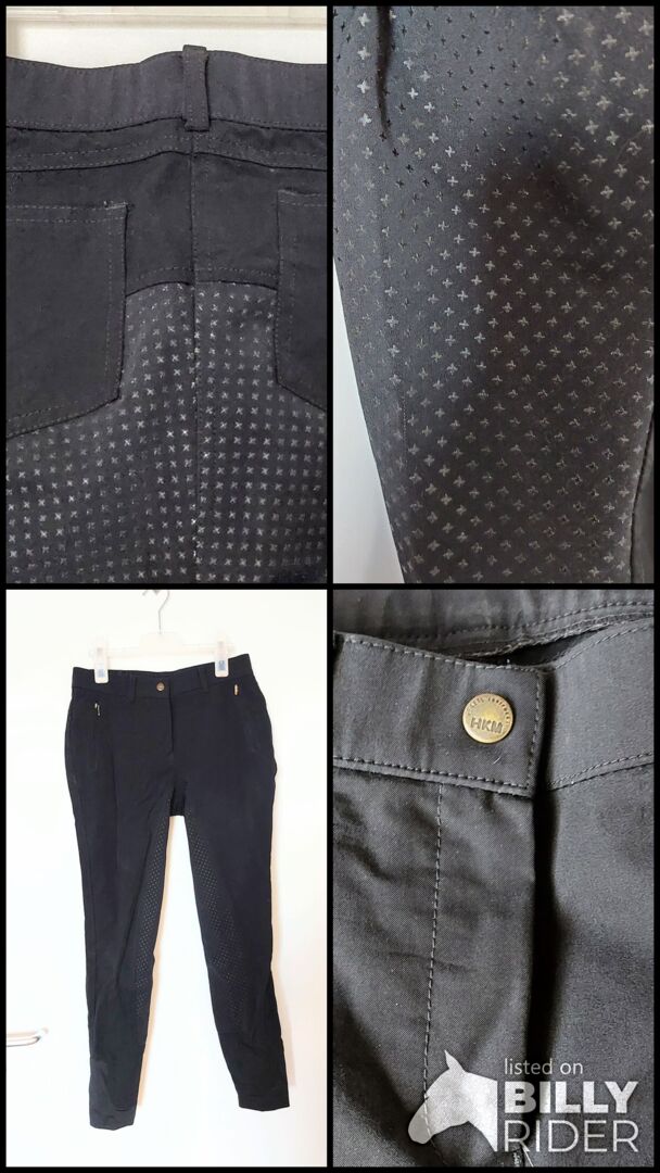 Bryczesy jeździeckie HKM wiatro/wodoodporne, rozmiar 38 - Bryczesy HKM bez uszkodzeń, stan bardzo dobry! Świetne do jazdy na zewnątrz, szczególnie w mokre dni. Odporne na wodę i wiatr! Pełne siedzisko, dobrze przylegająca guma. Nogawka (wewnątrz) 70cm, pas 36cm. 90% poliamid, 10% elastan