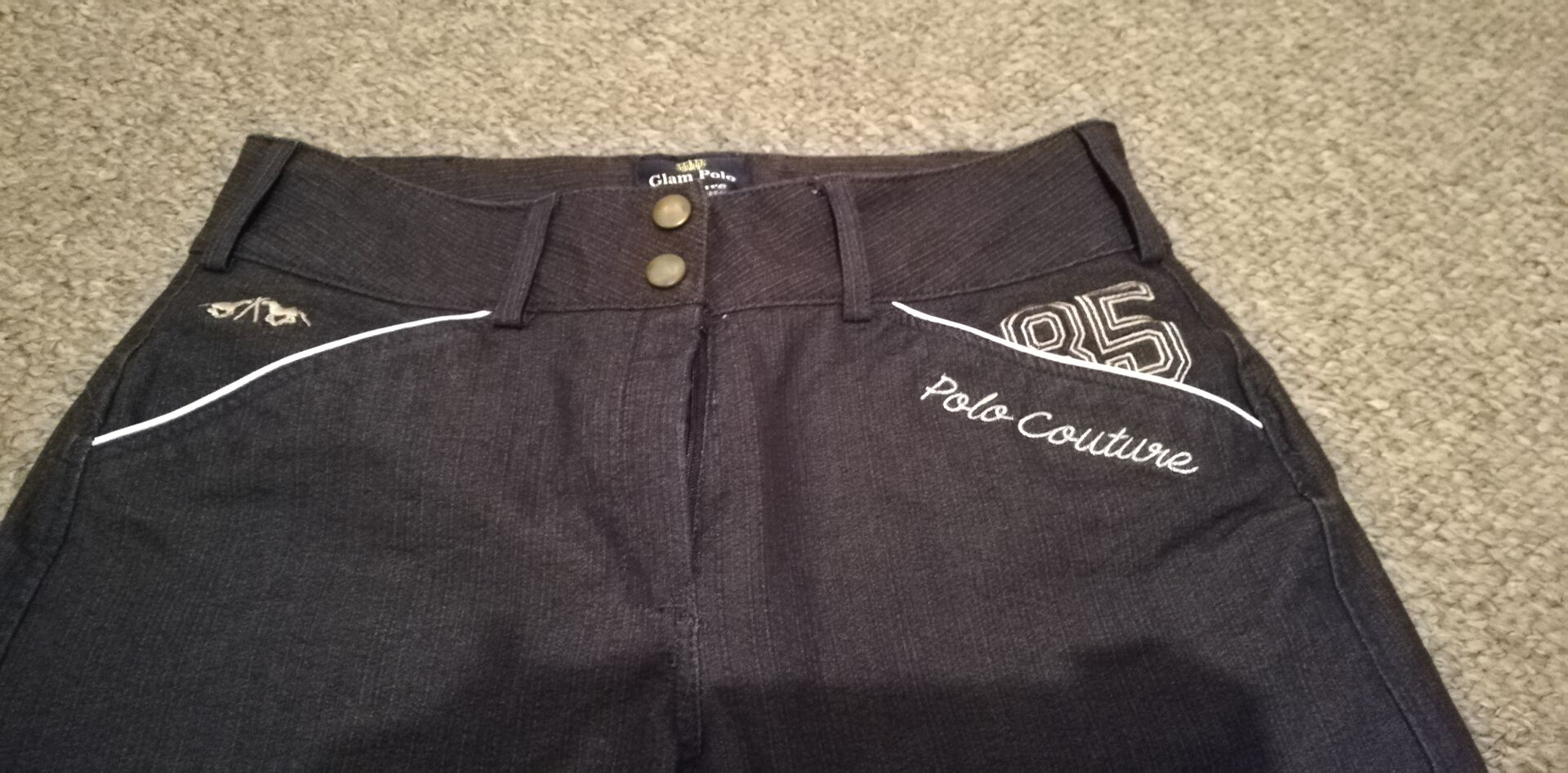Bryczesy jeździeckie HV Polo gr. 76 - Sprzedam czarne/szare bryczesy HV Polo w rozmiarze 76 z silikonowymi łatami na kolanach.