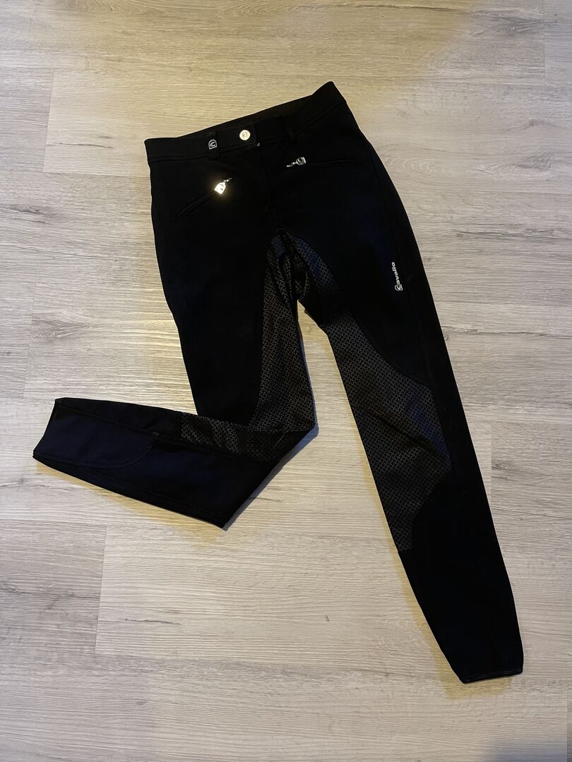 Bryczesy jeździeckie jak nowe od Cavallo 36 - Bryczesy w miętowym stanie, założone raz, są dla mnie za ciasne w pasie. Tkanina jest cienka i przeznaczona raczej na lato. Rozmiar między 34/36, pełne siedzenie. Etykieta została wycięta, ponieważ była drapiąca. Kolor: czarny