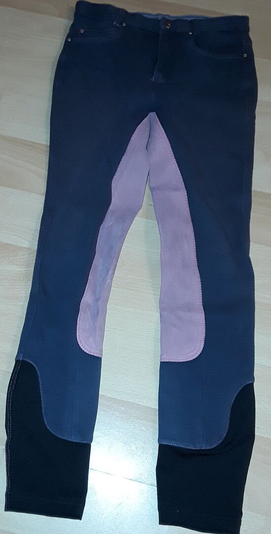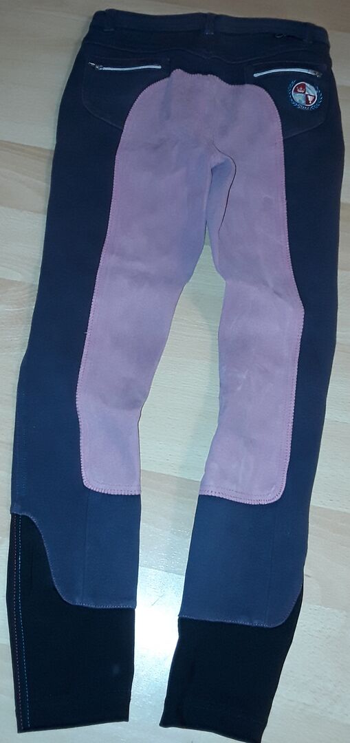 Bryczesy jeździeckie Krämer - Niebiesko-szare bryczesy z różowym materiałem na całym siedzeniu. Spodnie mają 2 kieszenie wcięte z przodu. Mankiety nogawek: elastyczne Rozmiar: 176