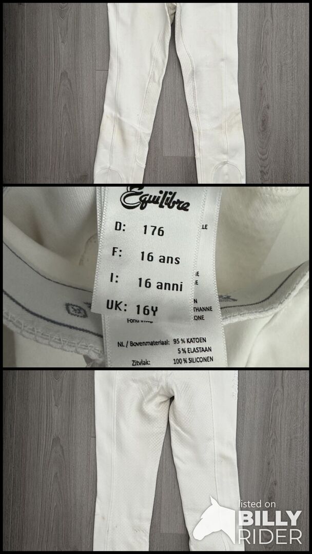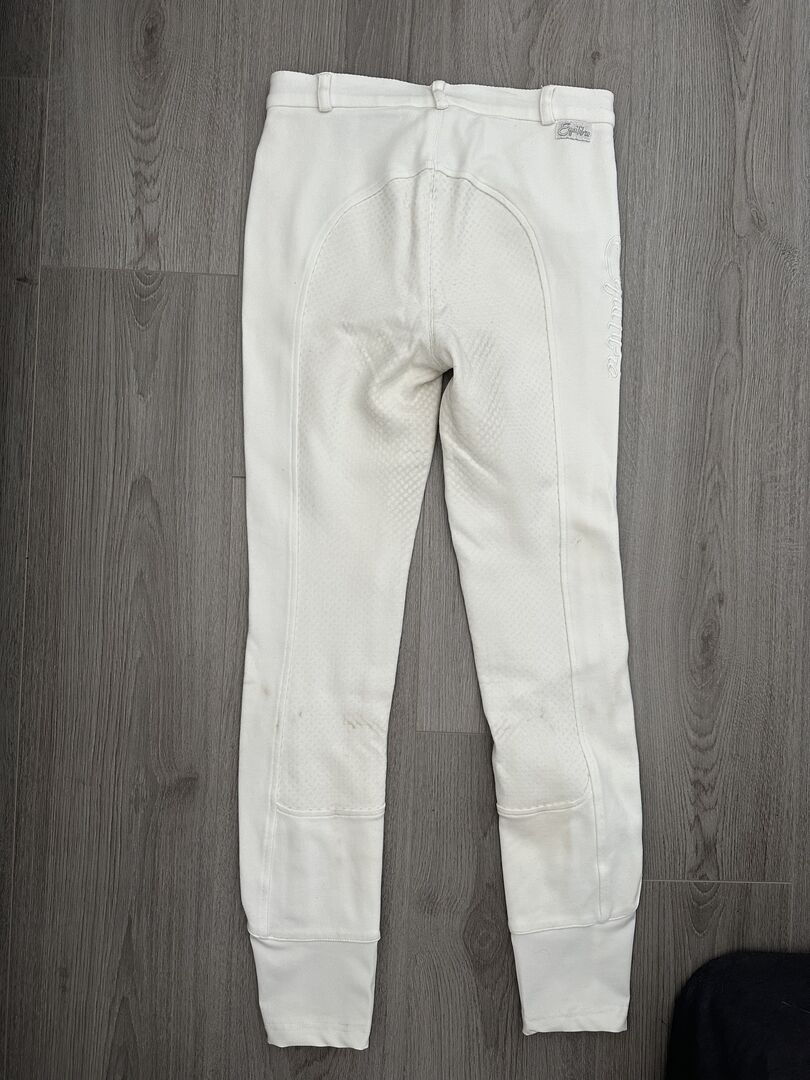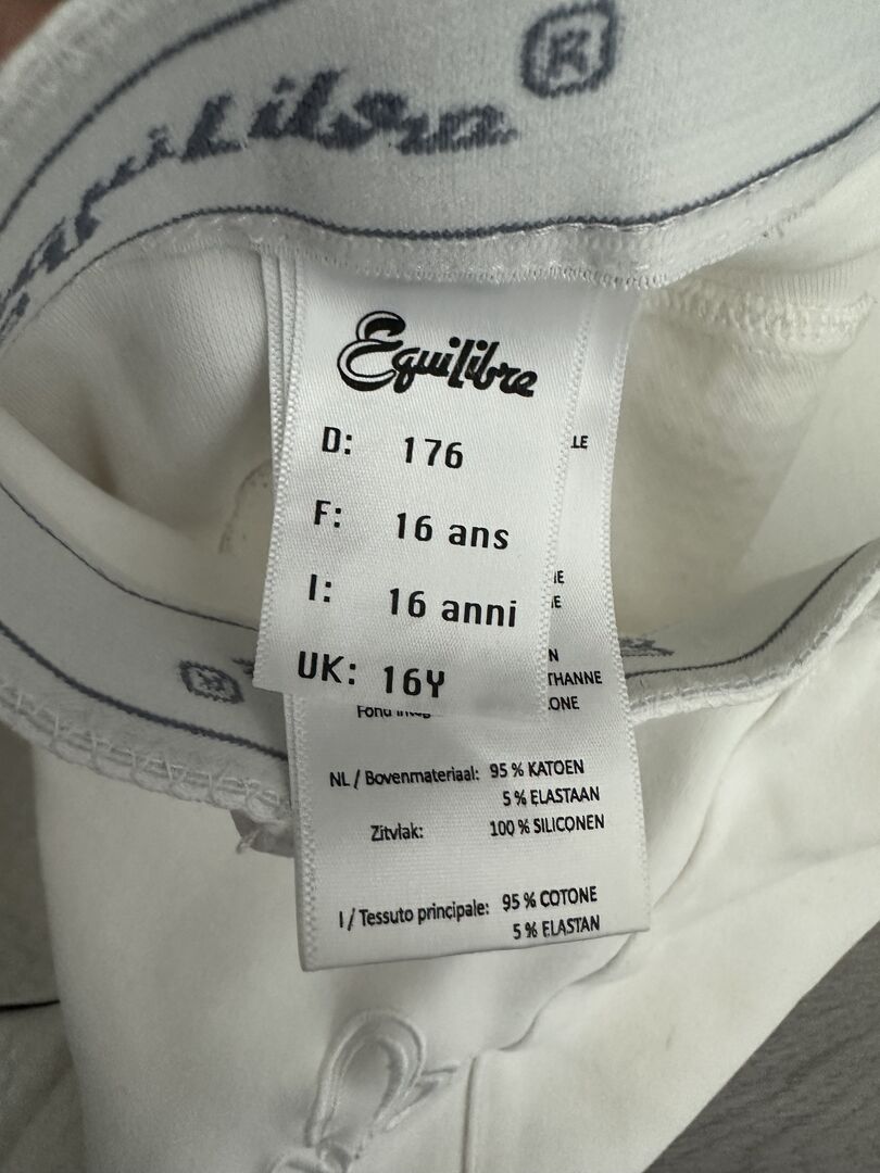 Bryczesy jeździeckie marki "Equilibre" - Na sprzedaż ledwo noszone białe bryczesy Equilibre w rozmiarze 176 z niewielkimi śladami zużycia.