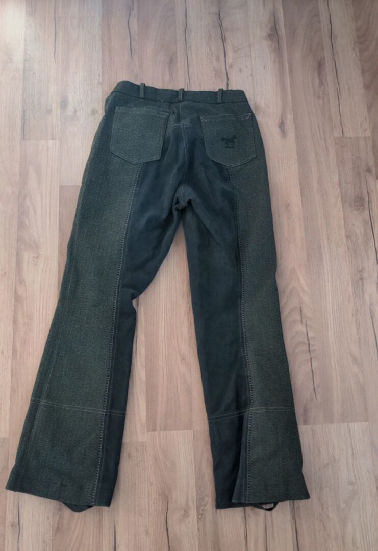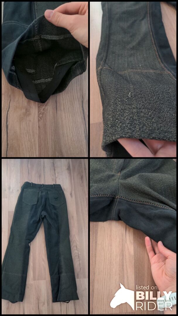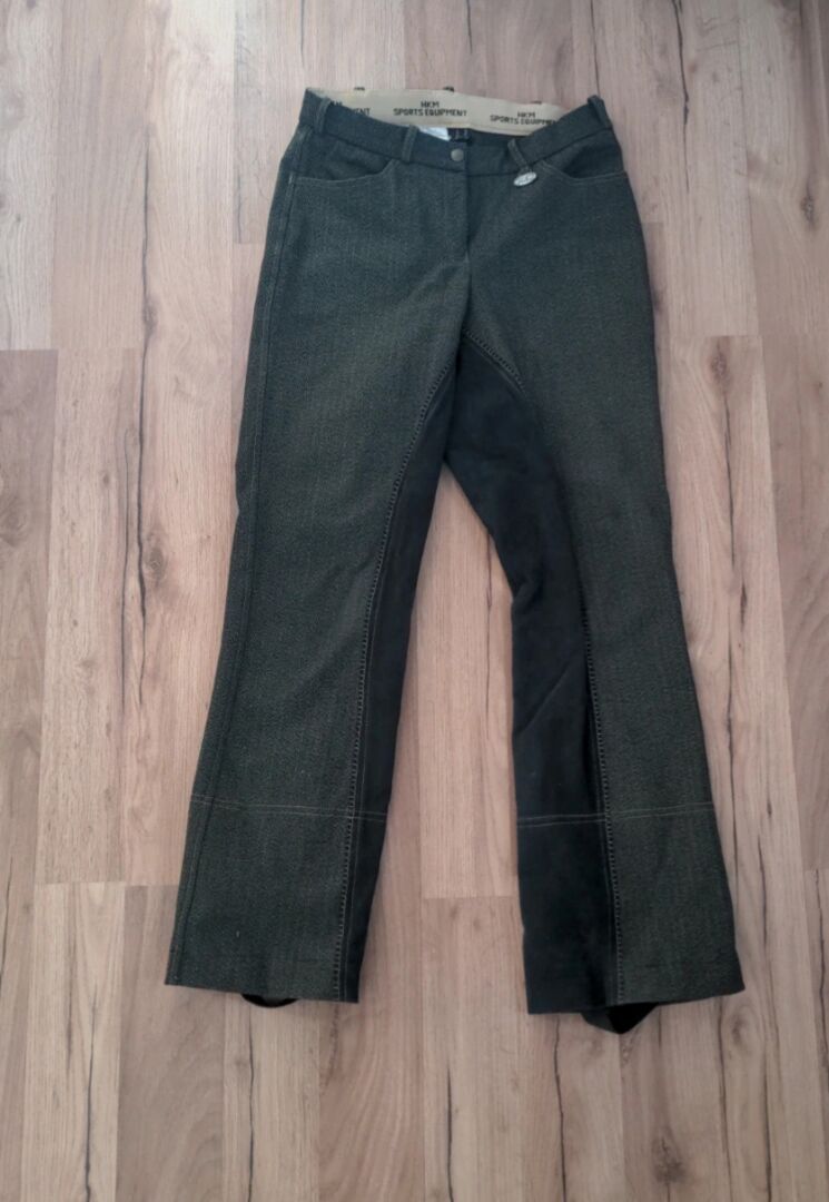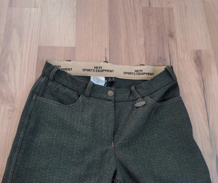 Bryczesy jeździeckie od HKM - Stan bardzo dobry, założone tylko kilka razy, ale kilka nitek zaciągnęło się na prawej nogawce, patrz zdjęcia, sprzedawane jako rozmiar 38. Mają nieco szersze nogawki w stylu kowbojskim.
