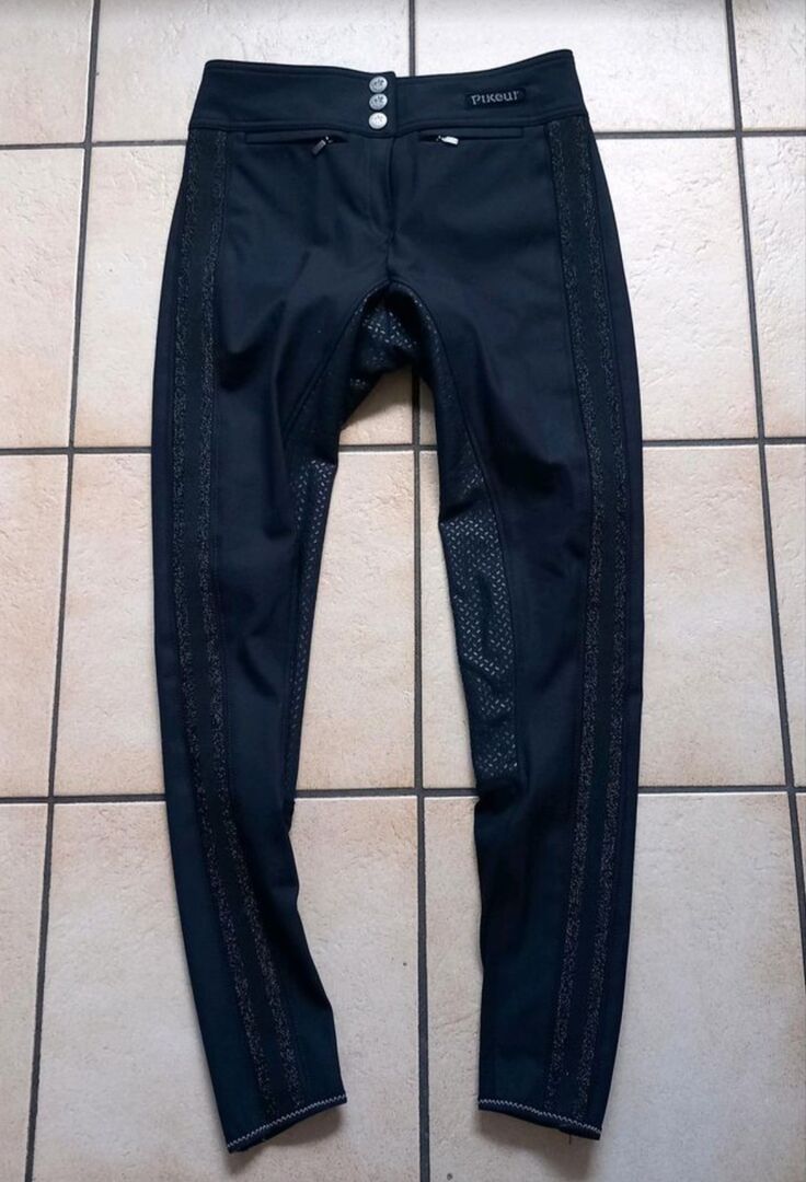 Bryczesy jeździeckie Pikeur Fullgrip Gr 76 - Bryczesy od Pikeur jak nowe Czarny rozmiar 76 (długi rozmiar 38) Fullgrip Wysoki pas Błyszczące paski po bokach nogawek Brak wad NP 199,- Gospodarstwo domowe dla niepalących