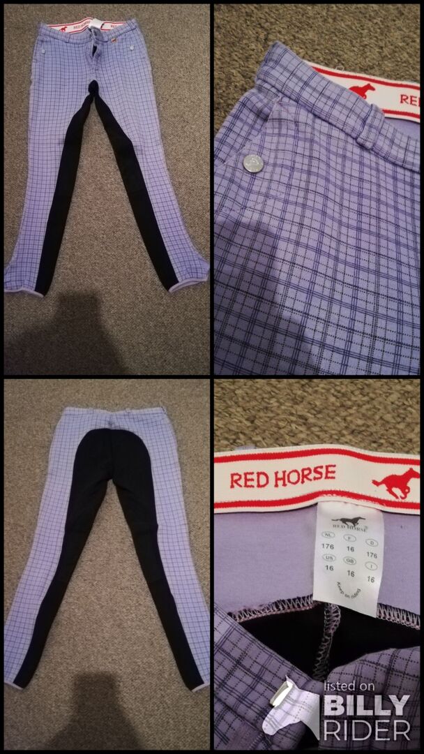 Bryczesy jeździeckie RedHorse gr. 176 - Sprzedam jasnofioletowe bryczesy RedHorse w rozmiarze 176 z łatami na kolanach.