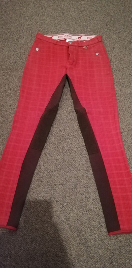 Bryczesy jeździeckie RedHorse gr. 176 - Bryczesy Red RedHorse w rozmiarze 176 z łatami na kolanach.