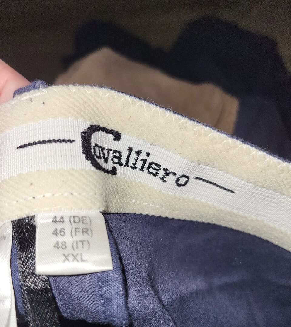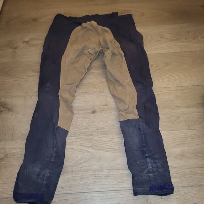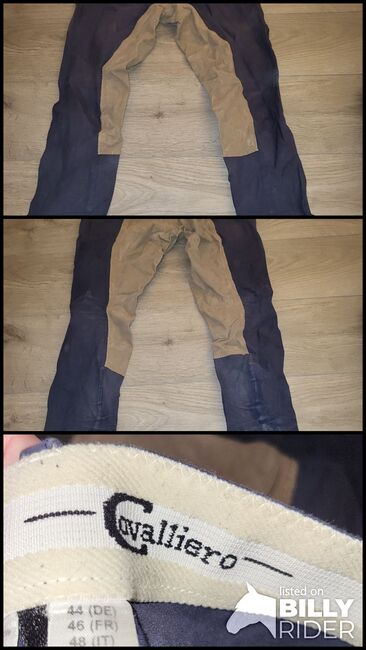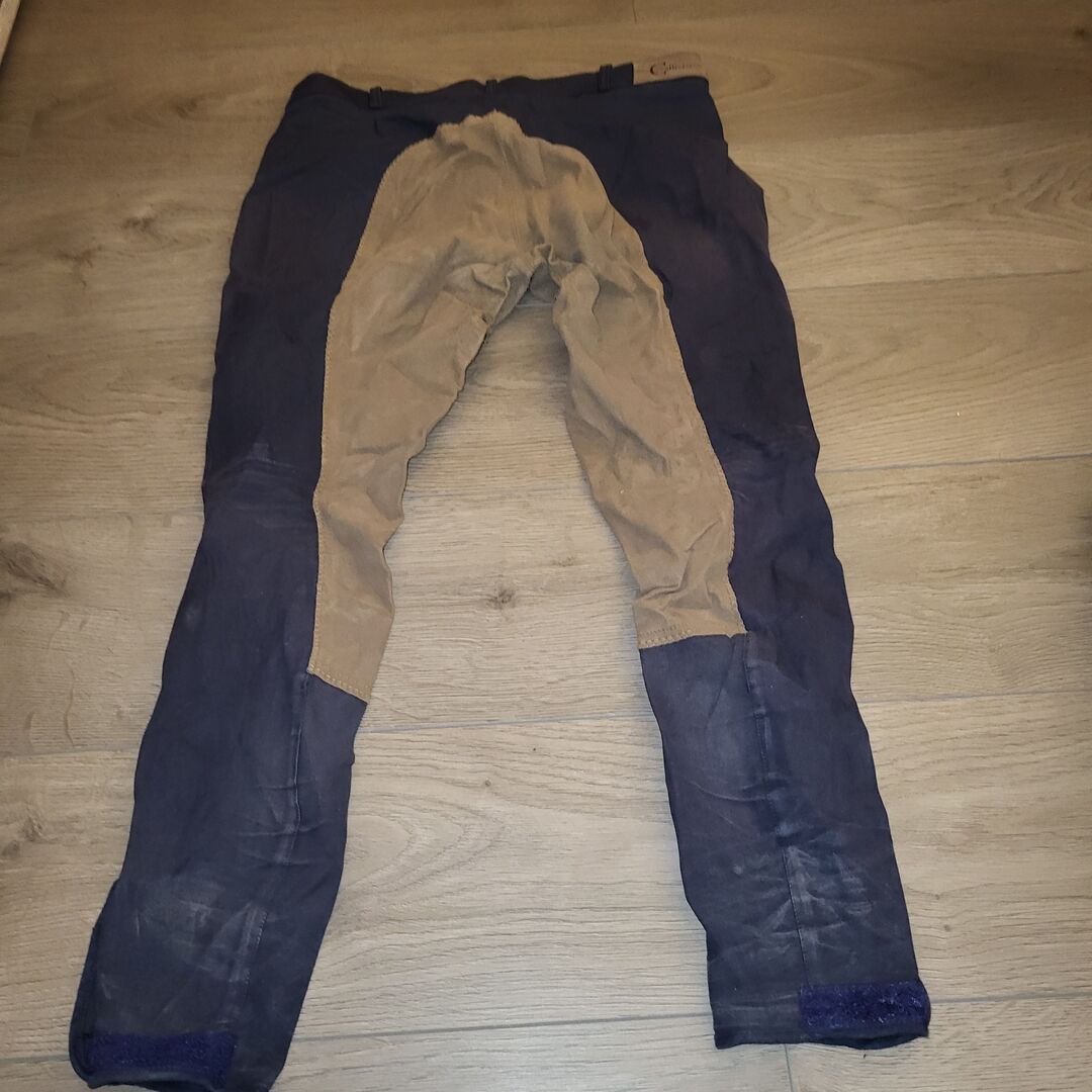 Bryczesy jeździeckie z pełnym skórzanym siedziskiem - Sprzedam używane damskie bryczesy jeździeckie Cavalliero w rozmiarze 44, ciemnoniebieskie z beżowymi skórzanymi wykończeniami na kolanach. Posiadają zapięcie na rzep na nogawce spodni. Spodnie mają pewne ślady zużycia, ale nie mają dziur itp... np. do pracy w stajni, ale nadal są dobre w użyciu i poza tym w pełni funkcjonalne.