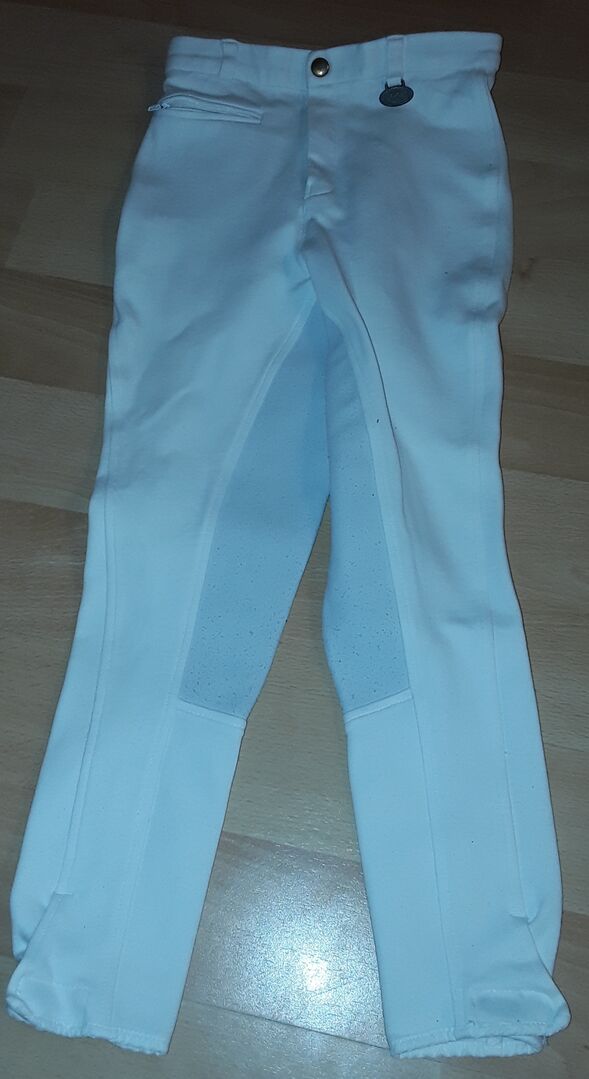 Bryczesy konkursowe - Białe bryczesy z pełnym siedzeniem z szarego materiału. Z prawej strony spodni znajduje się mała kieszeń zapinana na zamek. Zapięcie nogawki: rzep Rozmiar: 146