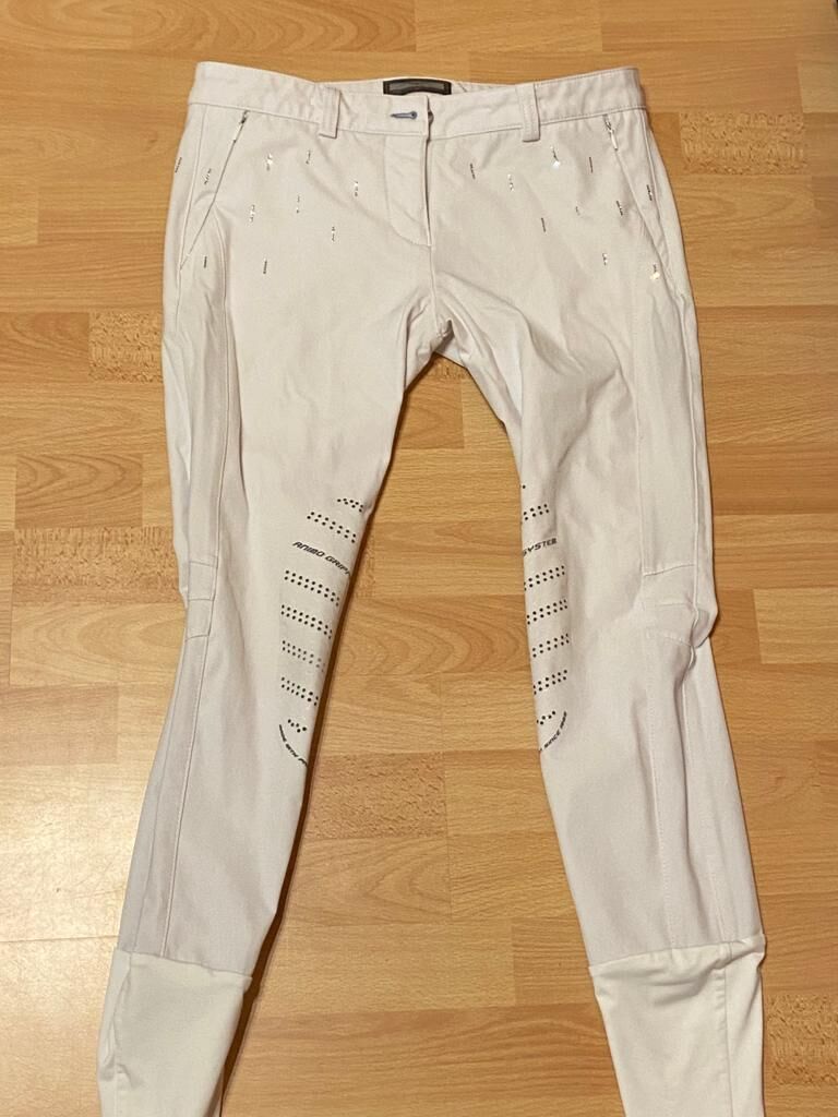 Bryczesy konkursowe Animo D38 - Bryczesy konkursowe D38 Uchwyt kolanowy w bardzo dobrym stanie Błyszczące aplikacje Niewielkie ślady zużycia Możliwość płatności Paypal