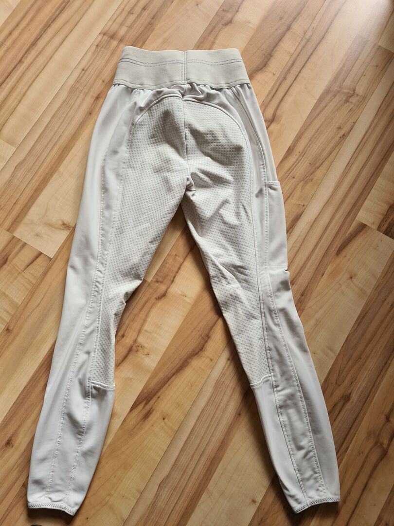 Bryczesy konkursowe Pikeur - Sprzedaję moje mało noszone i zadbane bryczesy konkursowe Pikeur. Mają rozmiar 36 i są wyposażone w 2 kieszenie zapinane na zamek błyskawiczny oraz boczną kieszonkę na telefon komórkowy. Posiadają również siedzisko z pełnym uchwytem. Jak widać na zdjęciu, na wykończeniach nóg są niewielkie plamy od siodła.