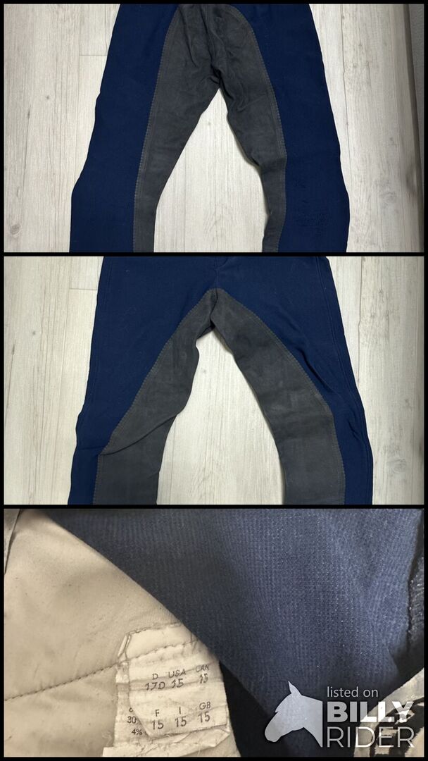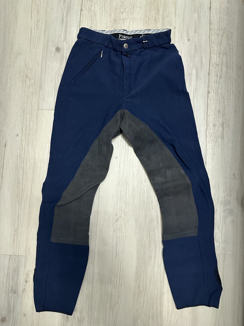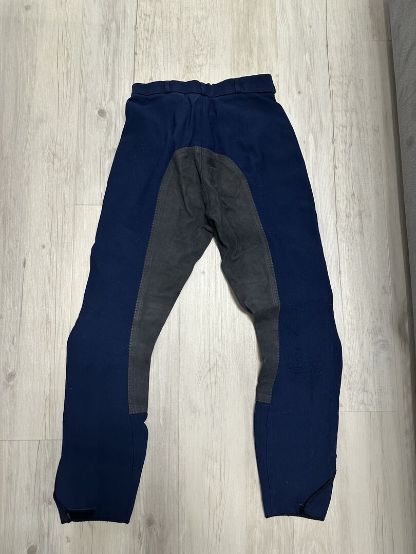 Bryczesy są ciemnoniebieskie z brązowymi skórzanymi wykończeniami i w rozmiarze 170