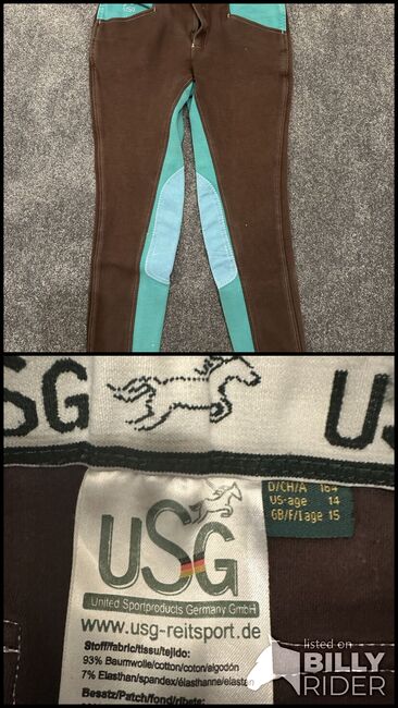 Bryczesy, rozmiar 164, od USG, za 20 € VHB - Sprzedaję bryczesy jeździeckie mojej córki. Są brązowo-turkusowe od wewnątrz i nadal wyglądają bardzo dobrze.