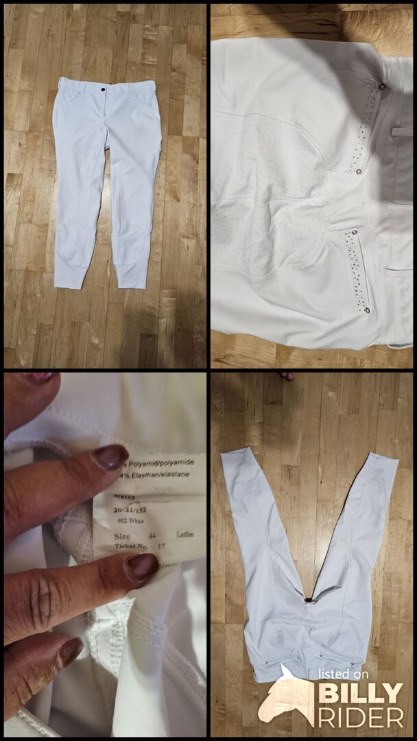Bryczesy turniejowe Wise - Sprzedaję parę białych jodhpurów w rozmiarze 44 z uchwytem, brokatem z tyłu i wszystkimi kamieniami. Nie wyprane, bez plam i innych śladów zużycia, bardzo wygodnie leżą na ciele.