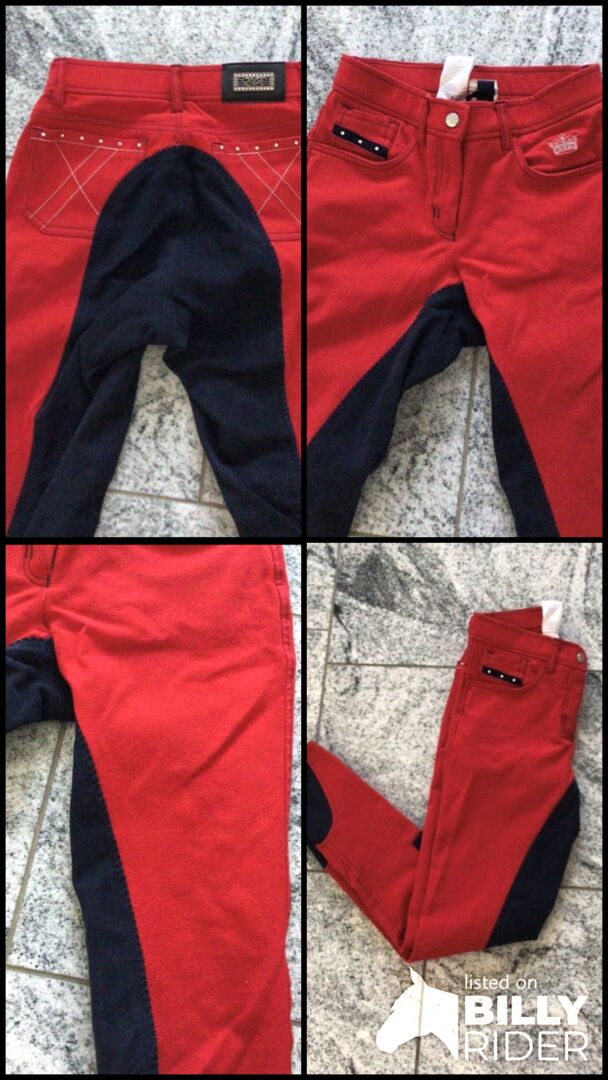 Bryczesy z pełnym siedzeniem czerwone / granatowe w rozmiarze S - W ofercie para rzadko noszonych bryczesów Eurostar w kolorze czerwonym z ciemnoniebieskim pełnym siedzeniem i elementami Swarovskiego w literze S.