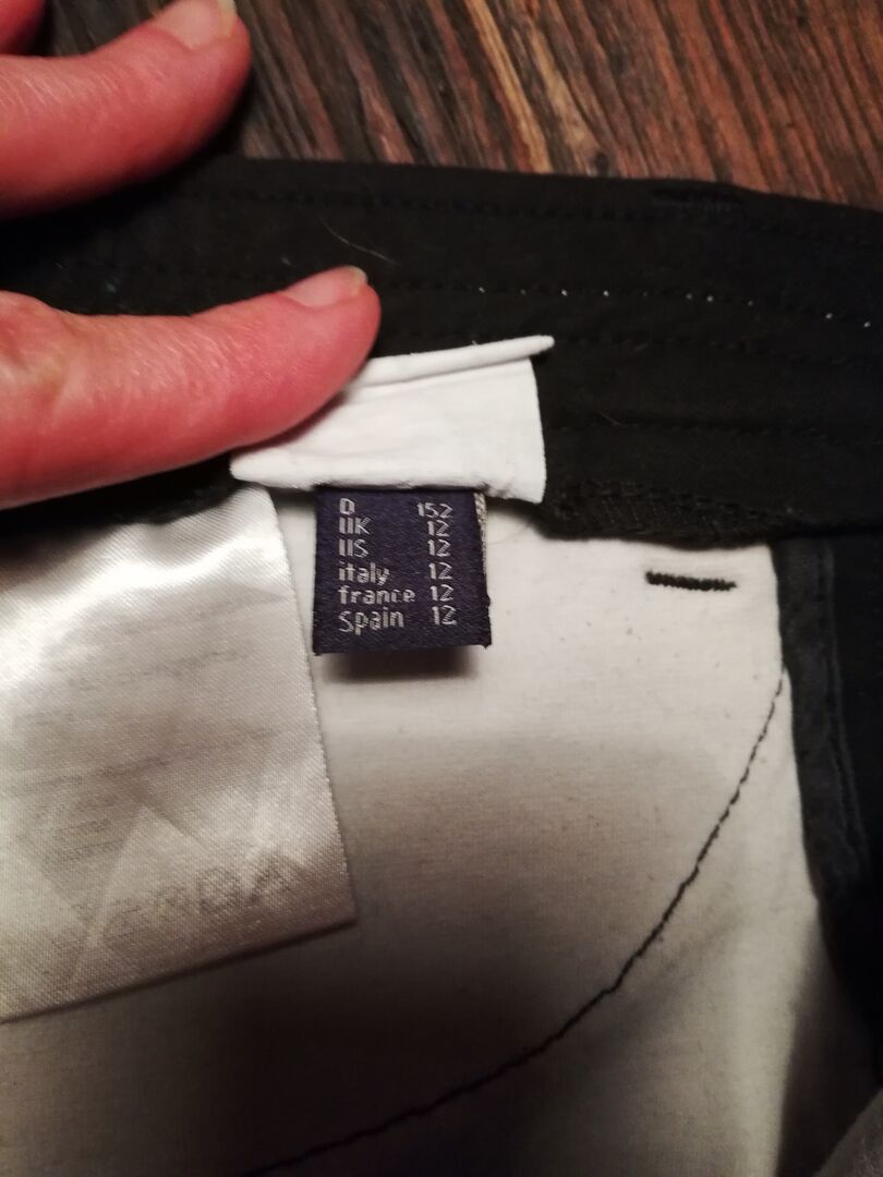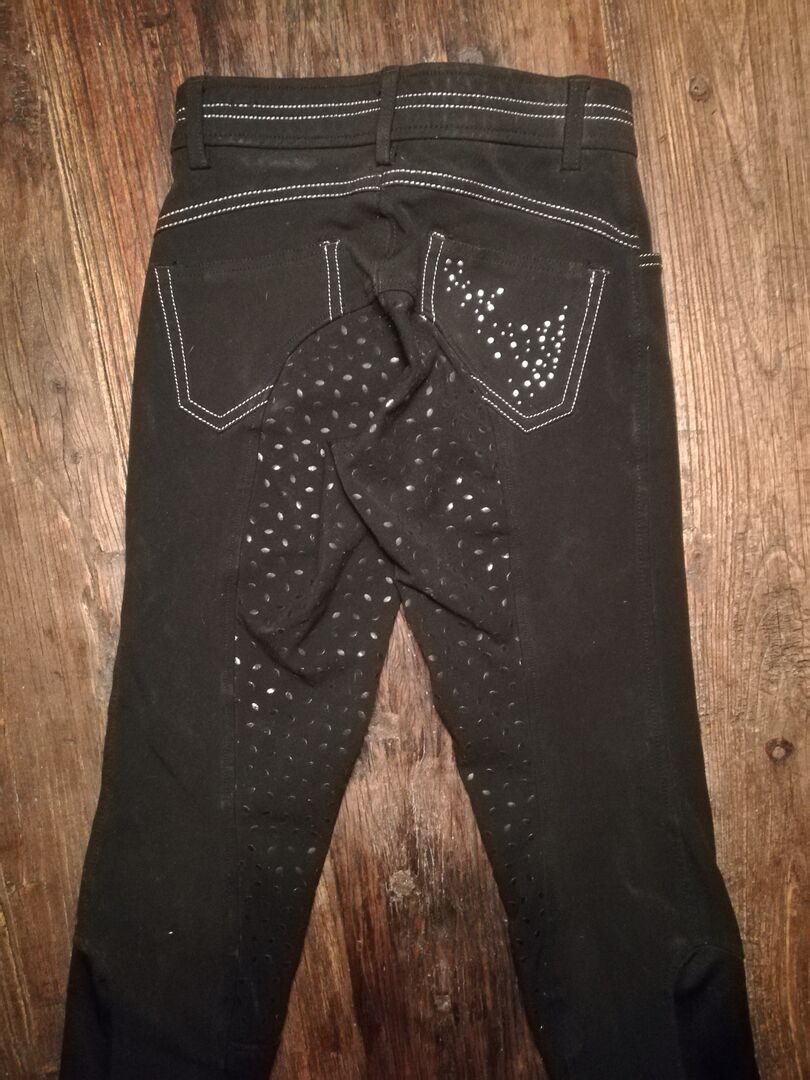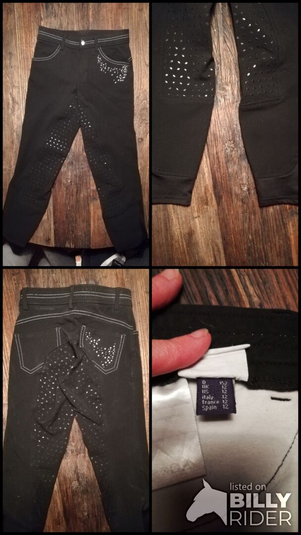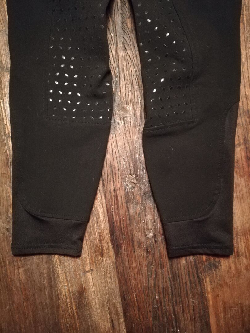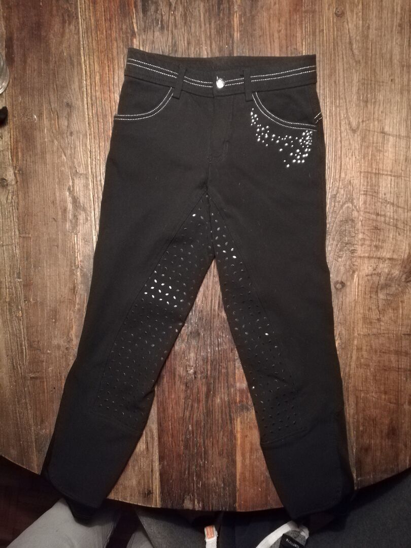 Bryczesy z pełnym siedziskiem - Czarne bryczesy dziewczęce z pełnym siedzeniem i elastycznymi mankietami nogawek. Kamienie na prawej tylnej kieszeni i lewej przedniej kieszeni. Brak zużycia elementów wykończeniowych. Noszona tylko kilka razy Rozmiar 152 Jak nowy NP 79,95 €