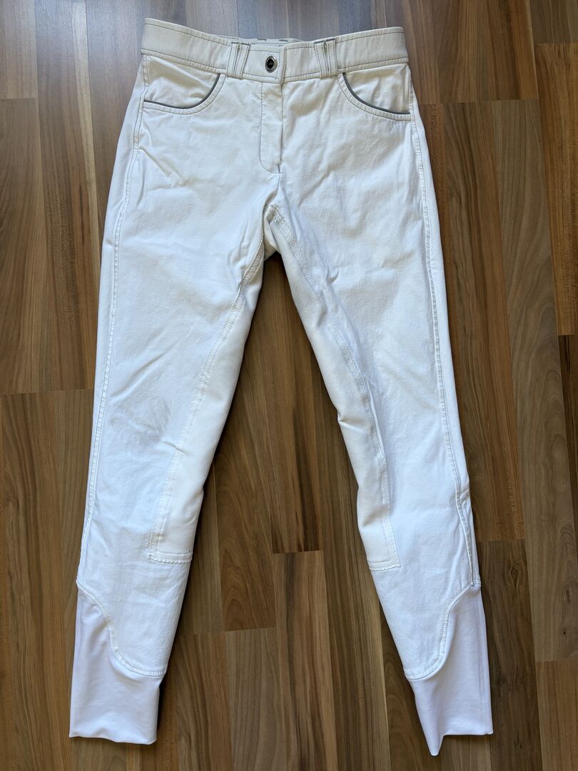 Bryczesy zawodnicze rozmiar 38 - Sprzedaję parę białych skórzanych bryczesów konkursowych Equi Theme w rozmiarze 38. Bryczesy były noszone z przyjemnością i mają niewielkie ślady zużycia od siodła. Poza tym są w pełni funkcjonalne i w dobrym stanie.