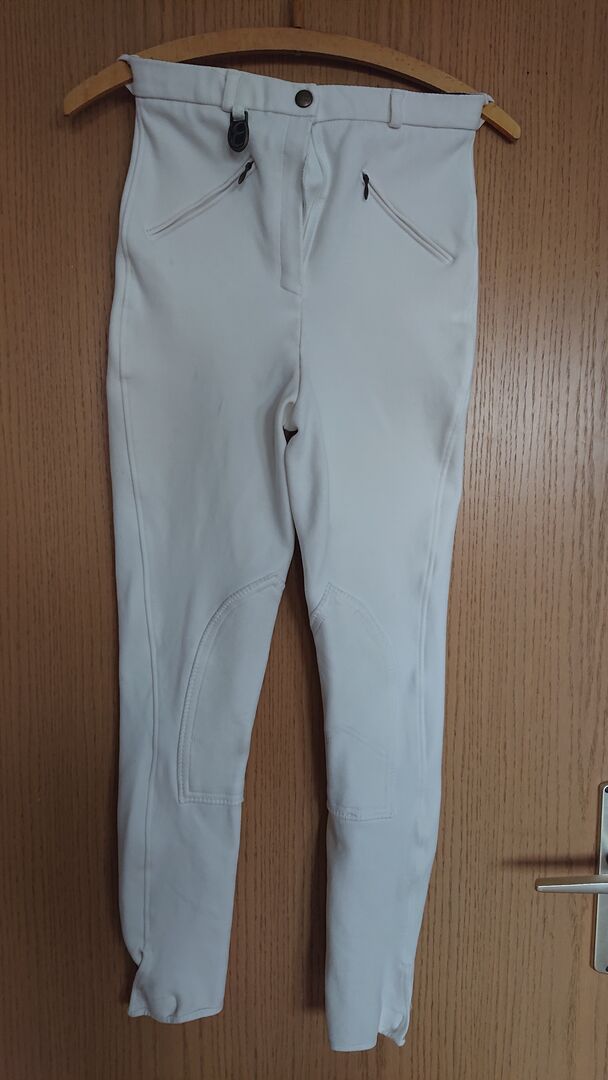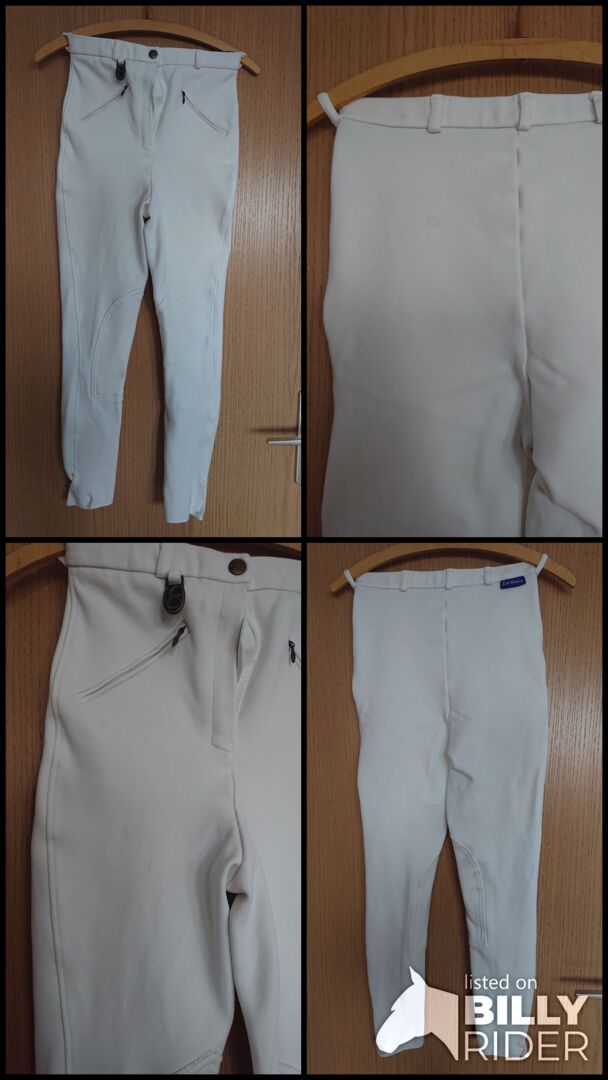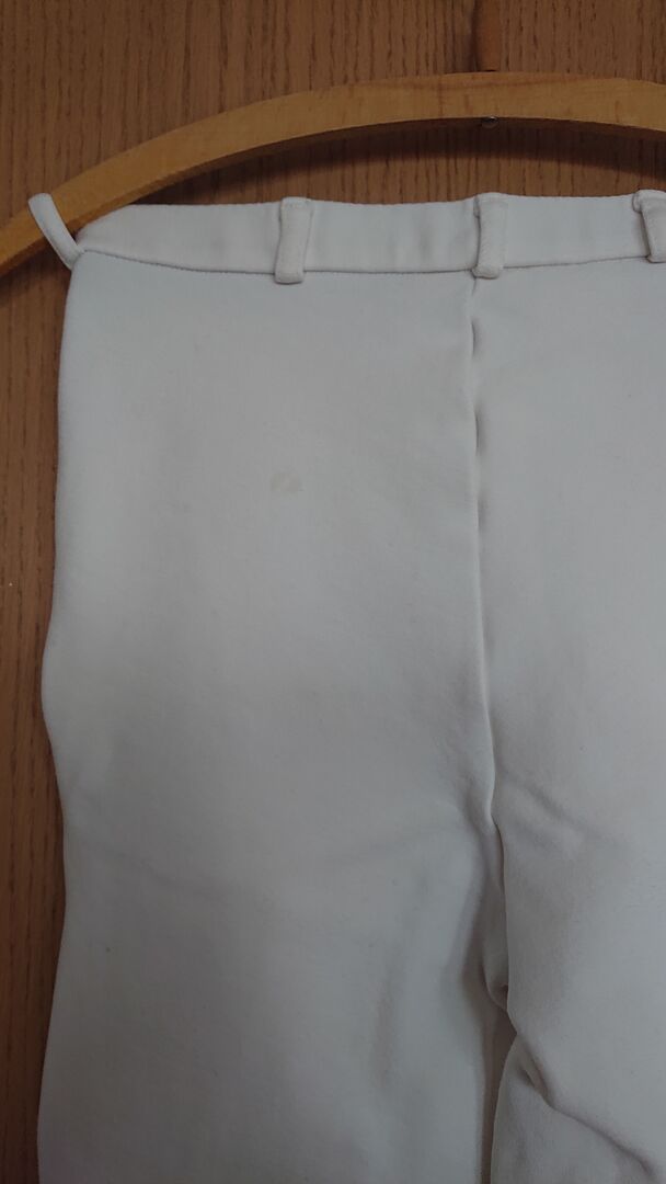 Bryczesy zawodnicze z łatami na kolanach marki Equlibre, rozmiar XS - Bryczesy konkursowe firmy Equlibre (od Krämer), obwód w pasie ok. 62/63 cm, czyli mały XS. Założone tylko raz na test jeździecki. Świeżo wyprane, ale niestety małe plamy z przodu iz tyłu (patrz zdjęcia), poza tym w idealnym stanie.