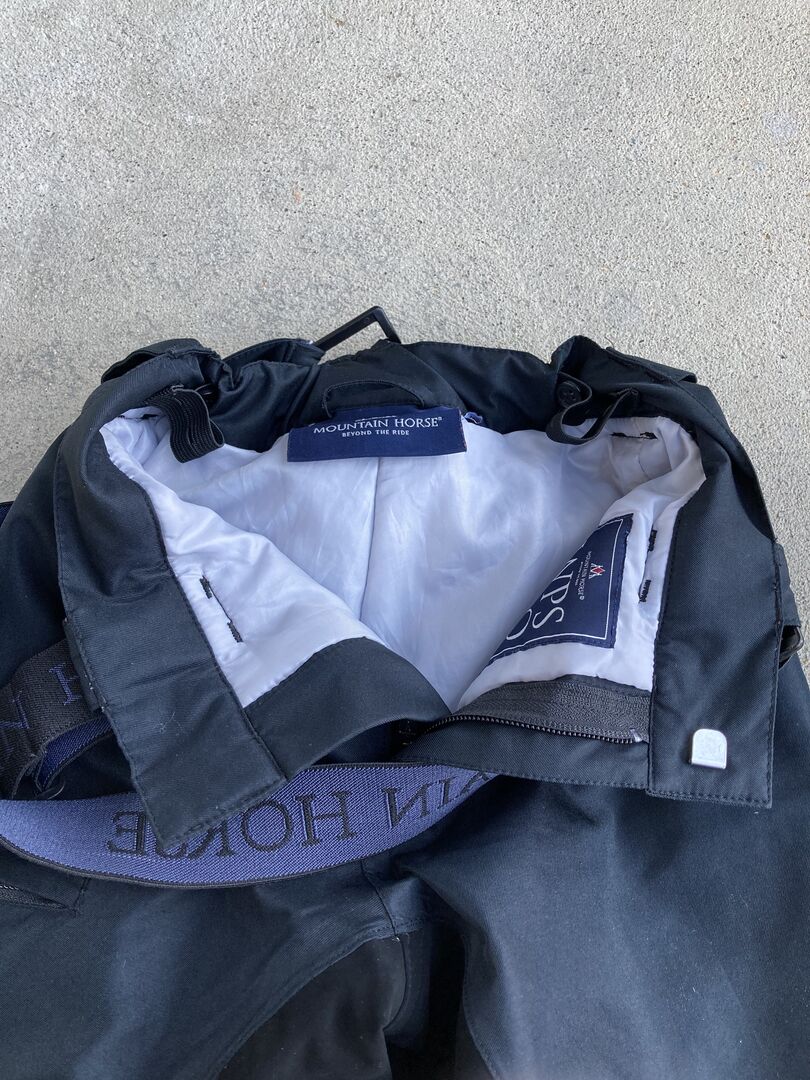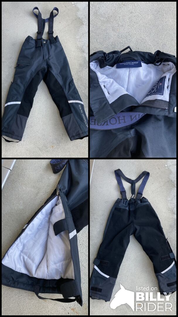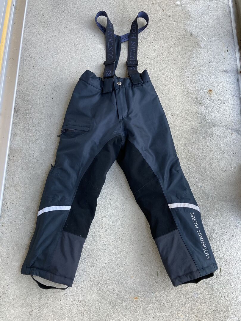 Bryczesy zimowe dla dzieci firmy Mountain Horse - W stanie jak nowe bryczesy overcoat firmy Mountain Horse na zimę w rozmiarze 120. Bryczesy są wodoodporne, wiatroszczelne i oddychające, posiadają tkaninę chwytną na siedzeniu i są ciepło wyściełane. Talia jest regulowana, szelki są odpinane, a mankiety nogawek są regulowane. Cena pierwotna wynosiła 120,-.