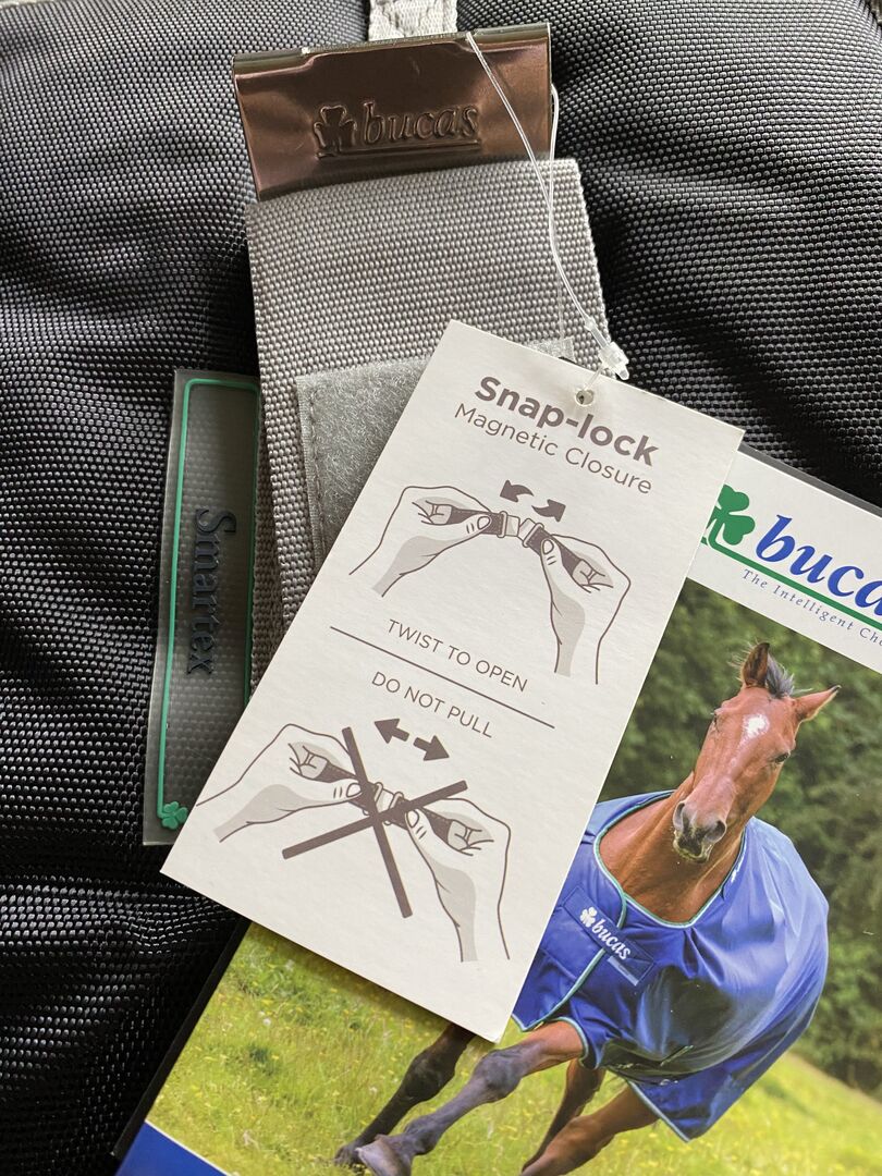 Nowy, oryginalnie zapakowany dywan Bucas w rozmiarze 155 cm w kolorze czarnym, szarym i jasnoszarym.