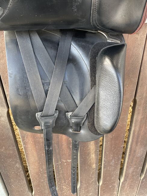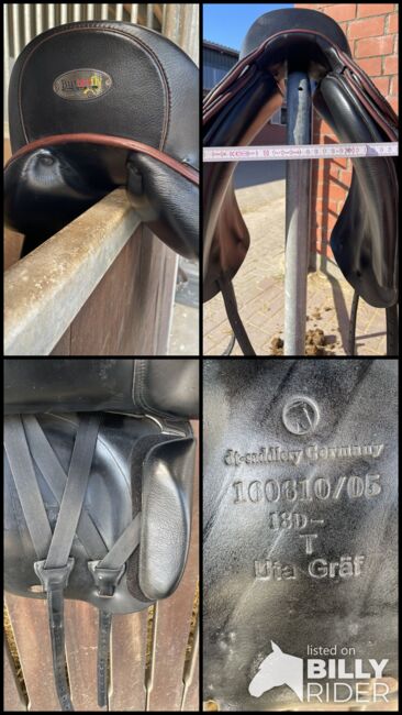 18-calowe głębokie siedzisko, również dla długich nóg, gotowe do natychmiastowego użycia. Kupione z drugiej ręki (sierpień 2022), kiedy siodło zostało właśnie sprawdzone (dowód dostępny na życzenie). Od tego czasu używane tylko sporadycznie (do włamania), od października 2024 roku po prostu wisi w szafie w domu. Kilka skaz na klapach siodła, poza tym w doskonałym stanie.
