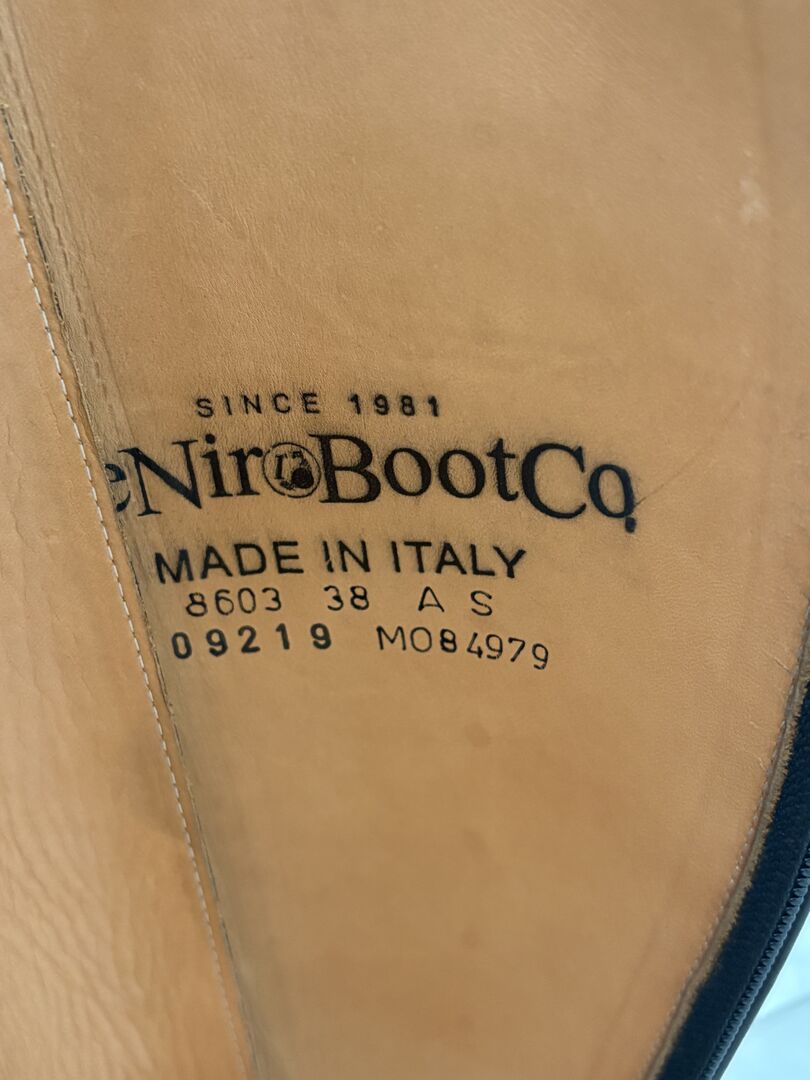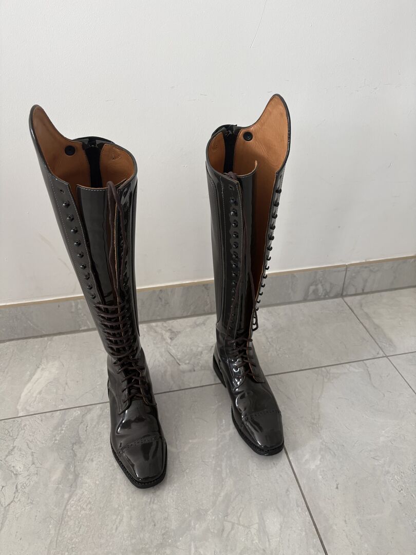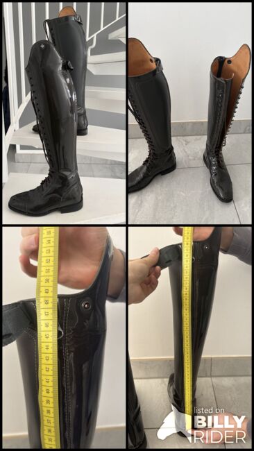 Buty DeNiro - rozmiar 38 - szary/lakier - prawie nie noszone - Sprzedaję wysokiej jakości buty ujeżdżeniowe DeNiro w rozmiarze 38. Buty były noszone tylko ok. 5 razy i są w bardzo dobrym stanie. Zostały zakupione w 2021 roku, a następnie przechowywane w suchym miejscu, ponieważ zrezygnowałam z jazdy konnej. Szczegóły: Marka: DeNiro - Rozmiar: 38 - Kolor: szary / patent - Białe szwy - Dziurkowany wzór z przodu buta - Stan: bardzo mało noszone - Oryginalna cena: 944 € - Więcej wymiarów można znaleźć na zdjęciach Cena: VB - realistyczne oferty można przesyłać do mnie. Sprzedaż prywatna: Sprzedawane jak widać, dlatego brak gwarancji, rękojmi lub zwrotu. Możliwa wysyłka lub odbiór.