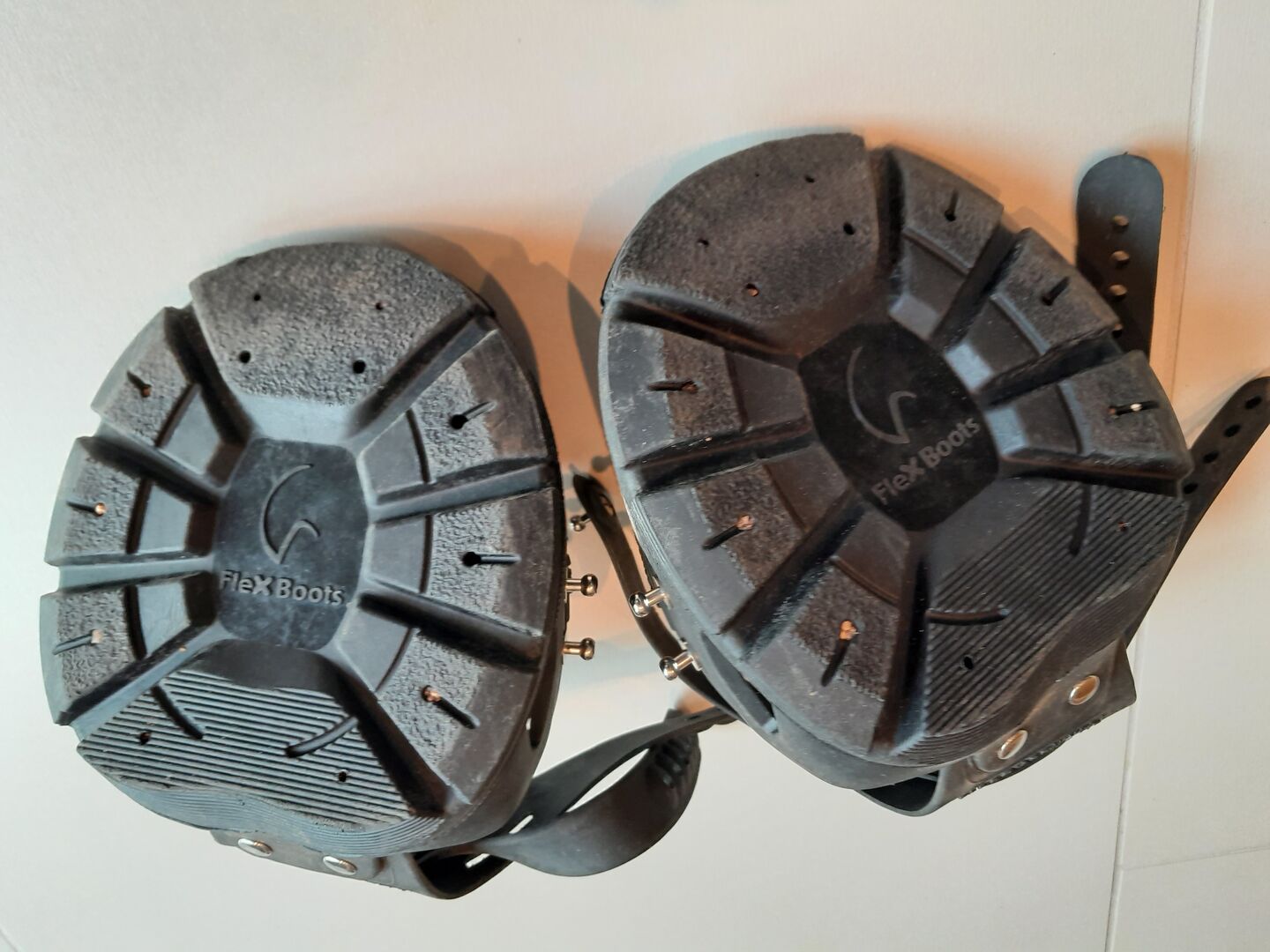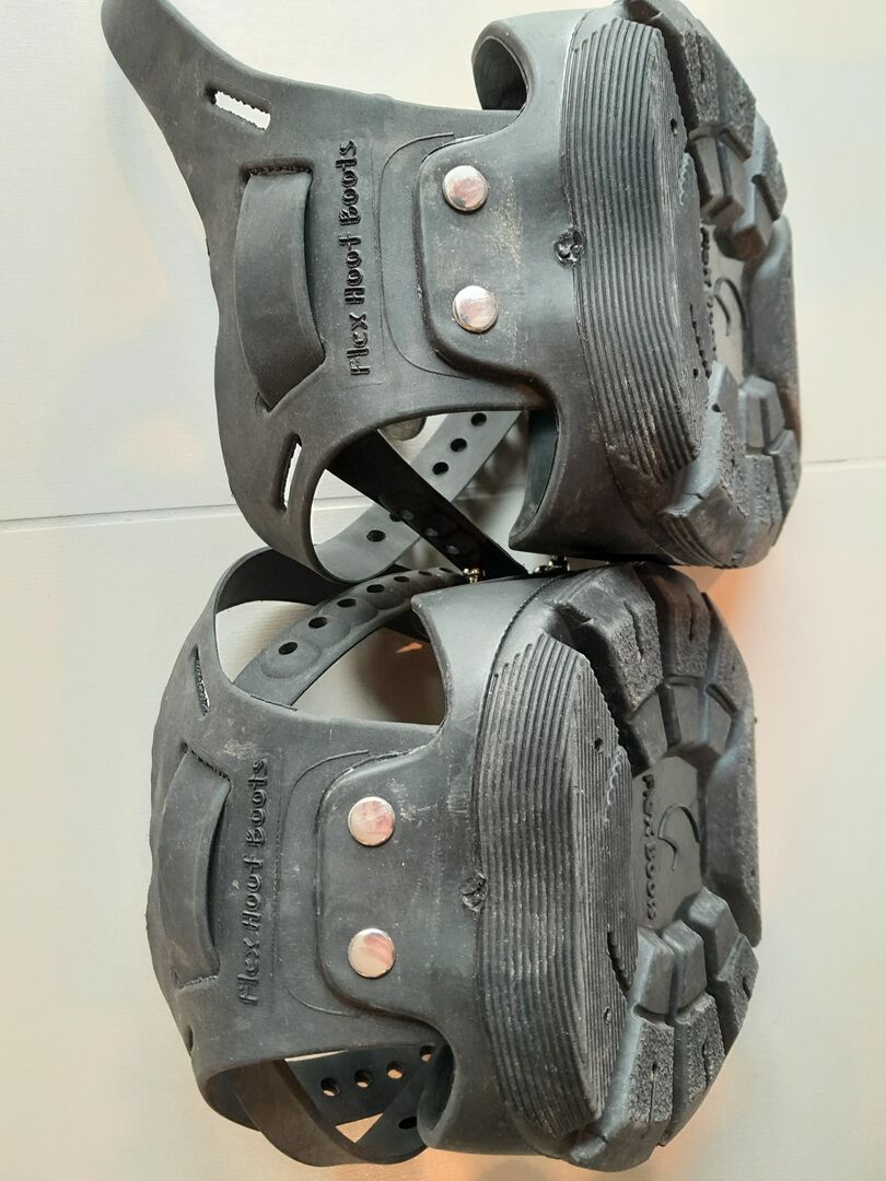 Buty do kopyt FlexBoots rozmiar 120 wraz z nowymi neoprenowymi sznurówkami neonowa zieleń - Buty do kopyt były założone tylko ok. 3-4 razy na krótką jazdę i były trochę za duże. Stąd lekkie ślady użytkowania, patrz zdjęcia. W zestawie z fabrycznie nowymi butami neoprenowymi w kolorze neonowej zieleni oraz zapasowym paskiem na płetwy.