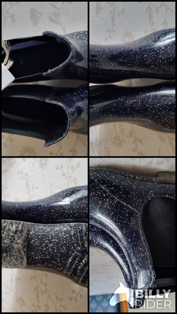 Reitschuhe (? Gummistiefel halbhoch schwarz mit Glitzer)