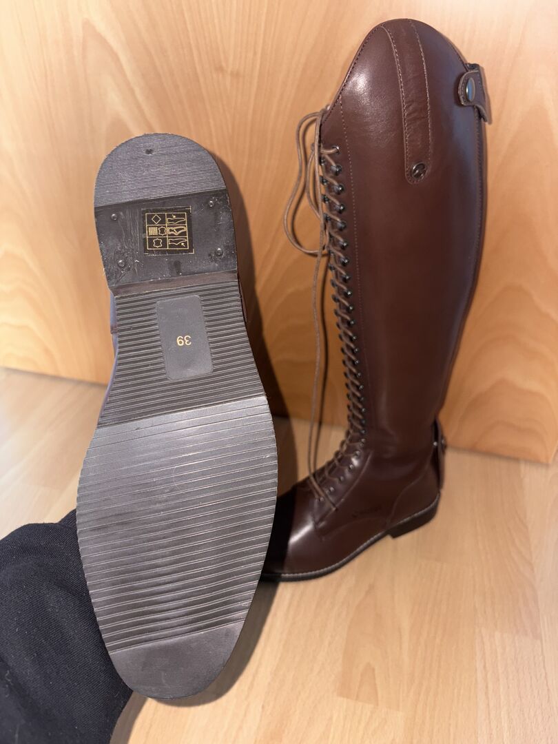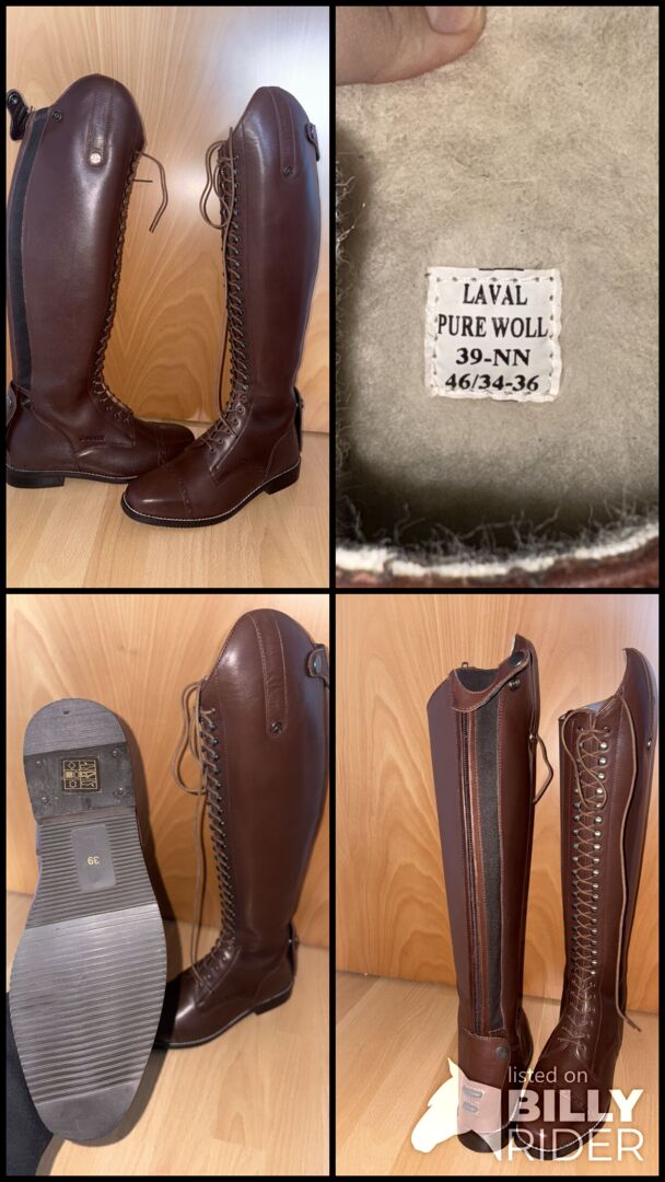 Buty jeździeckie Busse Laval pure Wool - Sprzedam nową parę butów jeździeckich firmy Busse, model Laval pure Wool w rozmiarze 39 NN (wysokość 46, szerokość regulowana od 34-36 za pomocą sznurowania). Buty nigdy nie były noszone ze względu na przerwę w jeździe, niestety teraz są dla mnie za duże.