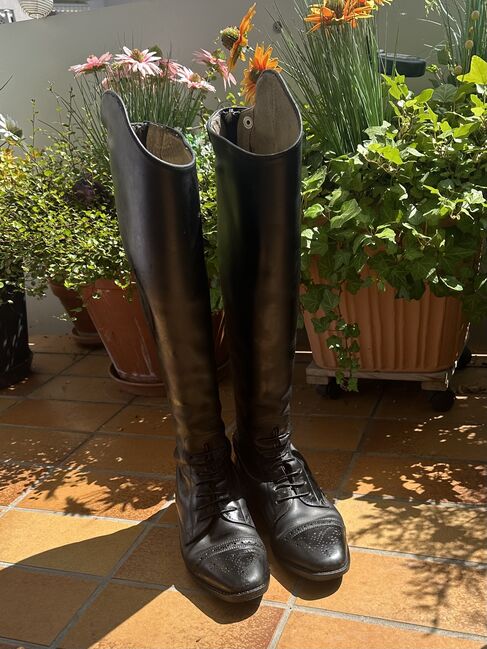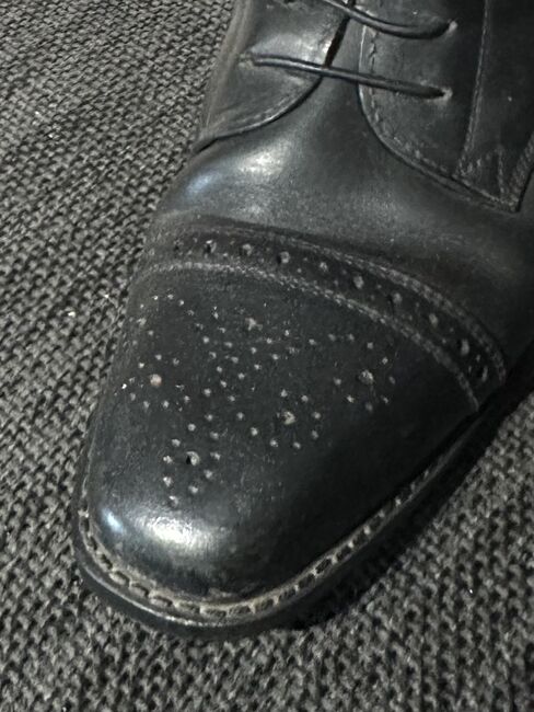 Rozmiar: 7 Wysokość: 55 cm (obecnie 52 cm) Szerokość: 37 cm VB: 199 € plus ubezpieczona wysyłka - Zamek błyskawiczny na całej długości z tyłu - Elastyczne sznurowanie - Budapesztański podnosek z dziurkowanym wzorem - Ergonomiczna skórzana wkładka - Super miękka, antypoślizgowa skóra cielęca typu box - Wysoka oryginalna cena