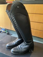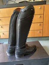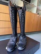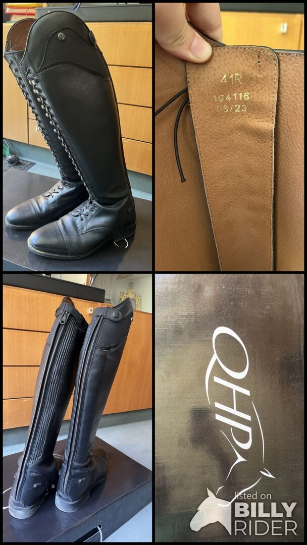 Buty jeździeckie, prawie nie noszone - Sprzedaję moje czarne skórzane buty jeździeckie marki QHP. Zostały zakupione 9 marca 2024 roku i były noszone dziesięć razy i pielęgnowane po każdym noszeniu. Posiadają zamek błyskawiczny z tyłu, uchwyt na ostrogę, brokatową ozdobę u góry łuku i sznurowanie z gumką z przodu, w zestawie znajdują się również zapasowe gumy, a także oryginalne pudełko i drzewka do butów. Nowa cena sugerowana wynosiła 179 € Rozmiar 41, regularny rozmiar cholewki