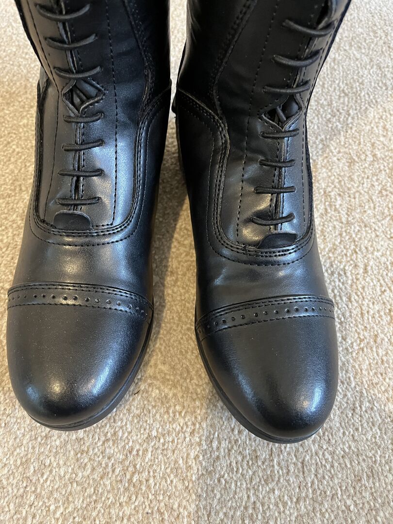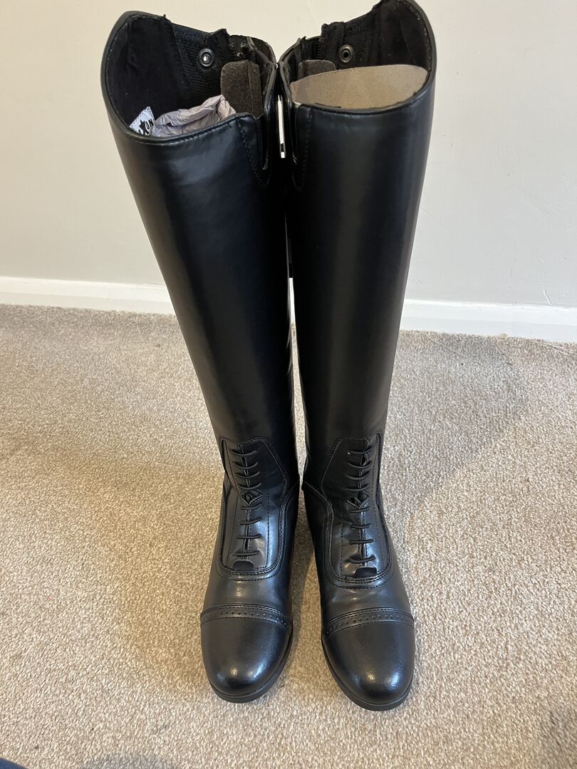 BNWT, ladies/older girls black leather riding boots. Purchased for my daughter but wrong size. They are UK Size 5/EU 38, regular calf width and regular height. Lost receipt so discounting from original price to sell.