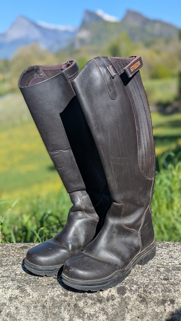 Buty jeździeckie STEEDS Rancher III z normalnym trzonkiem, rozmiar 38 - Niestety, but nigdy tak naprawdę mi nie pasował, więc prawie go nie używałem i większość życia spędził ze mną w domu. Pierwotna cena wynosiła około 150 CHF.