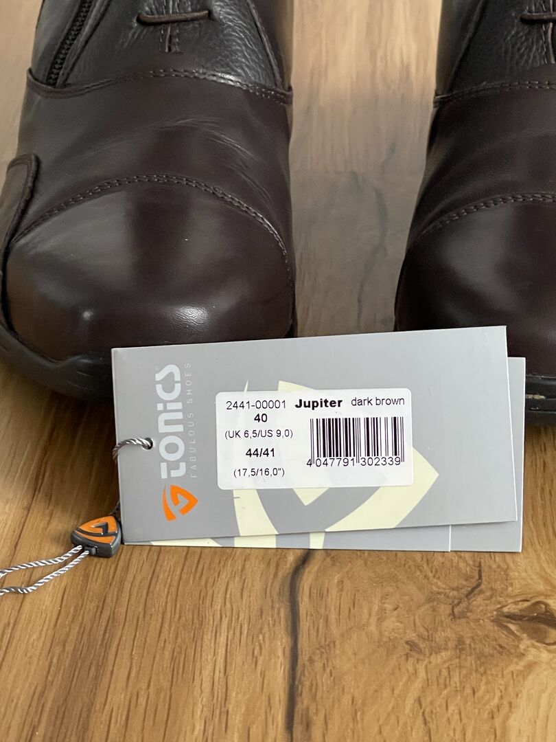 Buty jeździeckie Tonics Jupiter, NOWE, ciemny brąz, rozmiar 40, 44/41 - Sprzedam parę jak nowych butów jeździeckich Tonics "Jupiter" w kolorze ciemnego brązu, rozmiar 40. Buty zostały kupione pod koniec listopada 2022 roku i założone tylko 3 razy do jazdy, dlatego absolutnie jak nowe i bez uszkodzeń. Oryginalna cena 419€. W zestawie pudełko, worek z materiału, zapasowe wkładki.