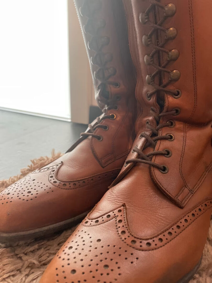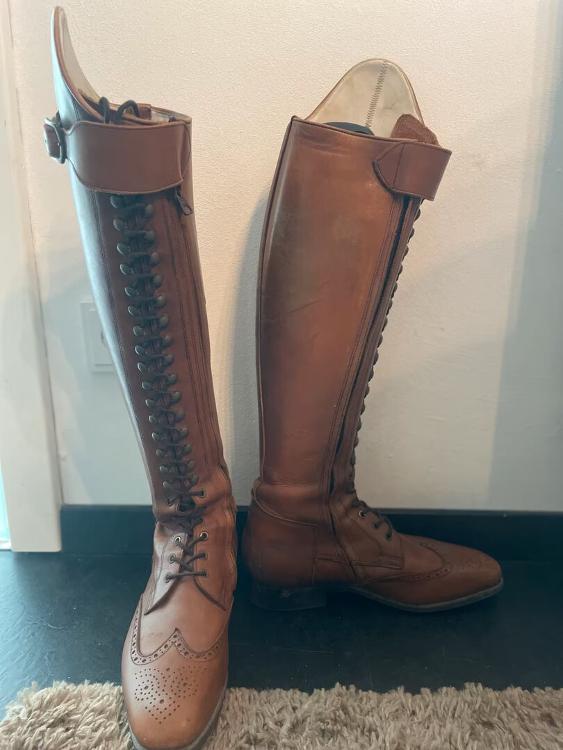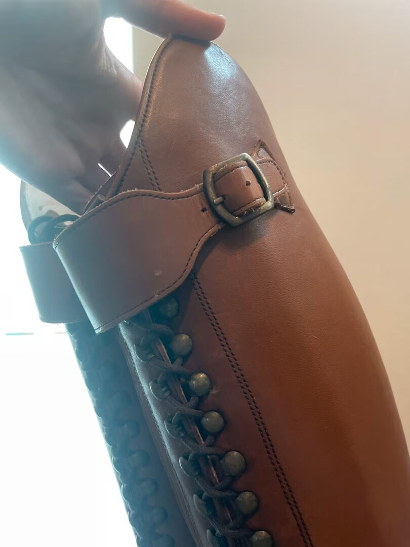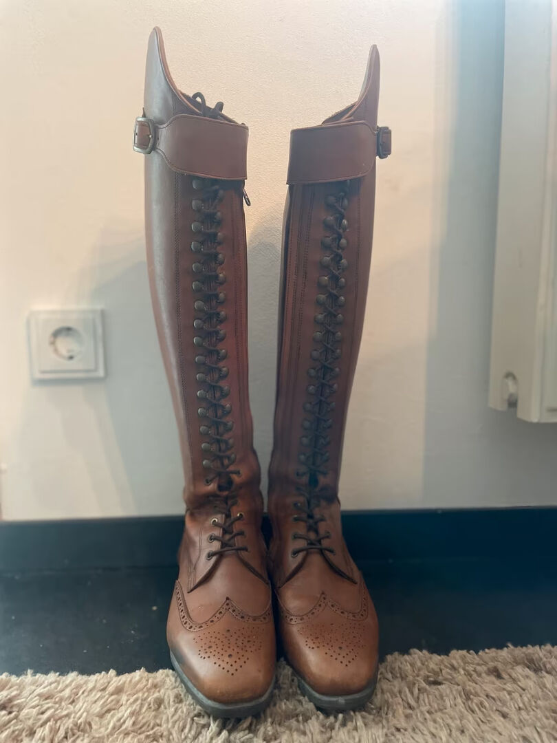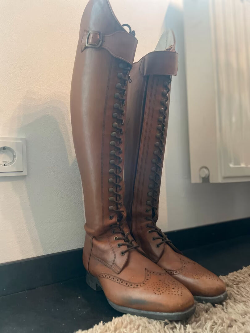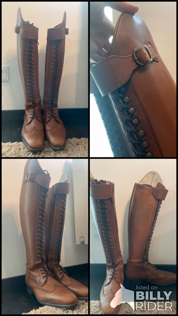 Buty ujeżdżeniowe Celeris - Sprzedaję moje buty ujeżdżeniowe marki Celeris lub "Reiten und Leder", które były noszone tylko przez niecały rok Szerokość łydki: 34-35 cm Wysokość wału: 45/46 cm Rozmiar buta: 40 Kolor koniakowy Ze sznurowaniem