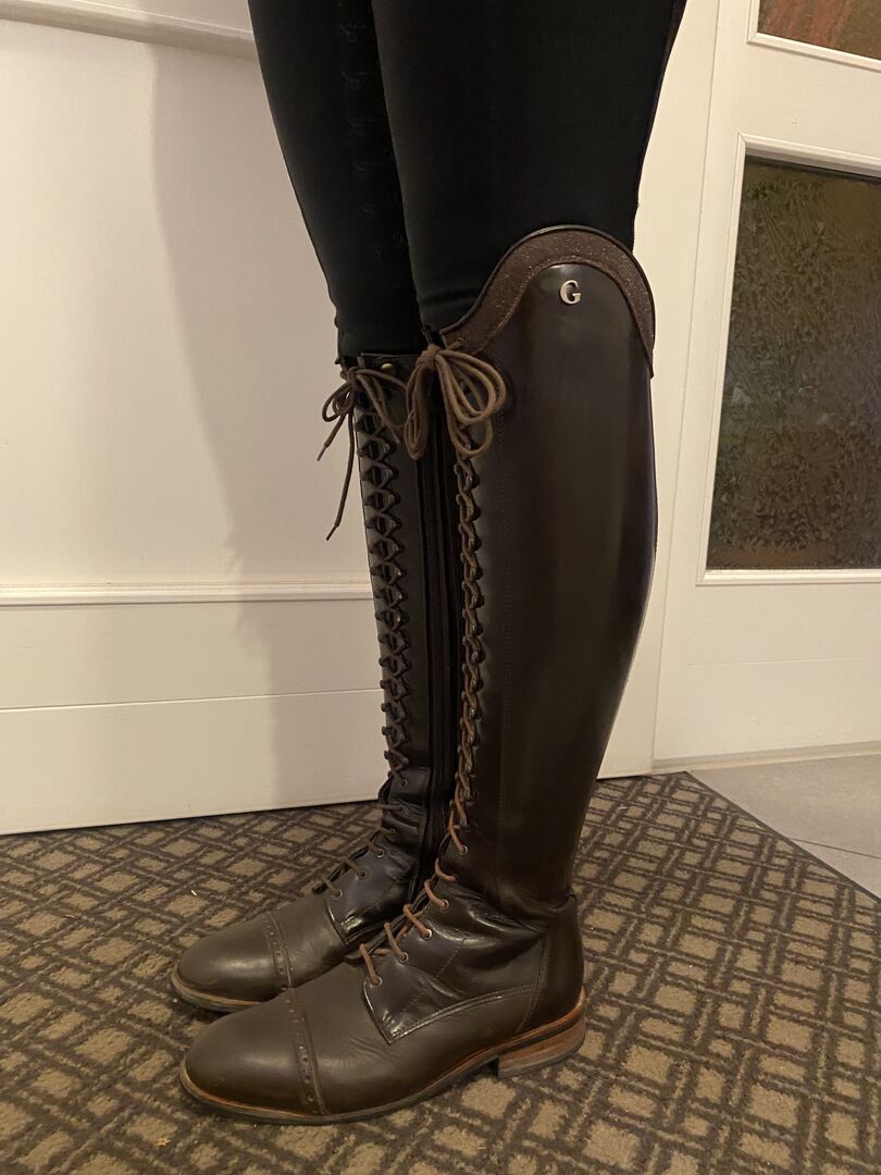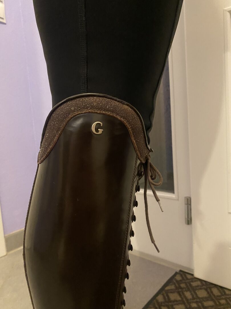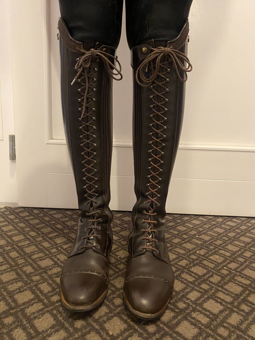Buty ujeżdżeniowe ze sznurowaniem - Na sprzedaż są wysokiej jakości, prawie nie noszone buty ujeżdżeniowe marki Gallors w rozmiarze 40. To model Laurel w kolorze brązowym z lakierowaną cholewką, brokatową kokardką i drobnymi ozdobnymi perforacjami na podnosku - przyciągają wzrok na arenie!