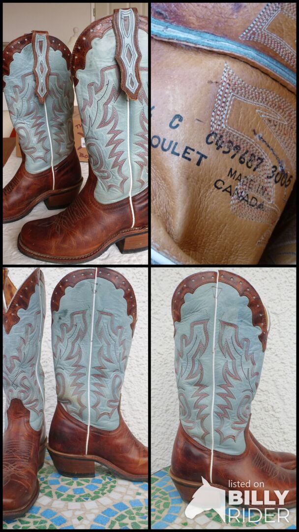 Buty westernowe firmy "BOULET" rozmiar 36/37 - Bardzo wysokiej jakości, ręcznie robione buty westernowe firmy "BOULET" z Kanady w rozmiarze 5 1/2. Założyłam je tylko trzy razy, ale niestety są na mnie za małe. Nie są tak nieporęczne jak większość butów westernowych. Prawdziwa skóra wewnątrz i na zewnątrz. Bardzo wygodne. Odciąłem klamry na wale, bo mi przeszkadzały. Można jednak zlecić ich ponowne założenie. Buty przyciągają wzrok !!! Na wszelkie pytania chętnie odpowiem w szybkim czasie. Pierwotna cena butów wynosiła 298,- euro. Więcej zdjęć w przyszłości !