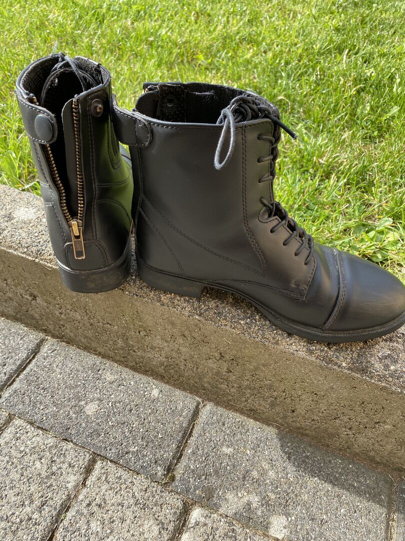 Buty za kostkę, buty do jazdy konnej - Oferowany dziecięcy but do jazdy konnej w rozmiarze 34 Sznurowane botki z zamkiem błyskawicznym i zatrzaskiem na pięcie. Używane, ale w bardzo dobrym stanie Możliwość płatności Paypal Wysyłka za dodatkową opłatą