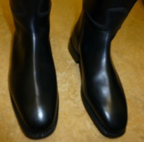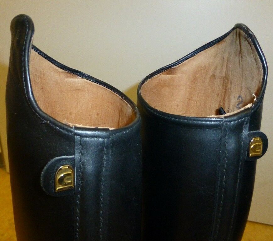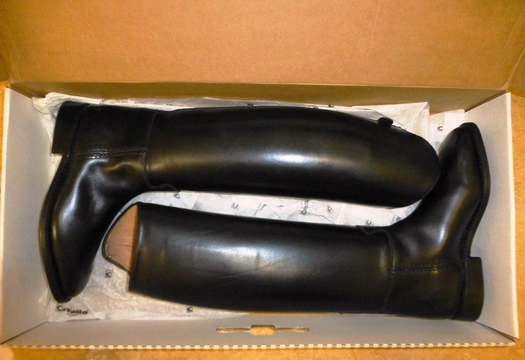 Cavallo ® Piaffe ujeżdżalnia skórzane buty jeździeckie rozmiar 6.5 H49 W36 New OVP - Na sprzedaż para nowych oryginalnych butów ujeżdżeniowych Cavallo® model "Piaffe" z czarną skórzaną podeszwą zewnętrzną i nabijanymi obcasami, dla eleganckiego jeźdźca ujeżdżeniowego. Buty ujeżdżeniowe mają piękny, wysoki, zakrzywiony łuk ujeżdżeniowy i złote logo Cavallo. Buty marki są zgrzewane Goodyear® i wykonane z delikatnej francuskiej skóry Boxcalf; wygodna wkładka. W oryginalnym pudełku. Stan: nowe, tylko przymierzone, podeszwa z niewielkimi śladami. Rozmiar: 6,5 (według tabeli Cavallo = 40); Wałek: wysokość 49 cm (bez łuku ujeżdżeniowego), łydka 36 cm typu "H" (więcej patrz tłoczenie wewnątrz).