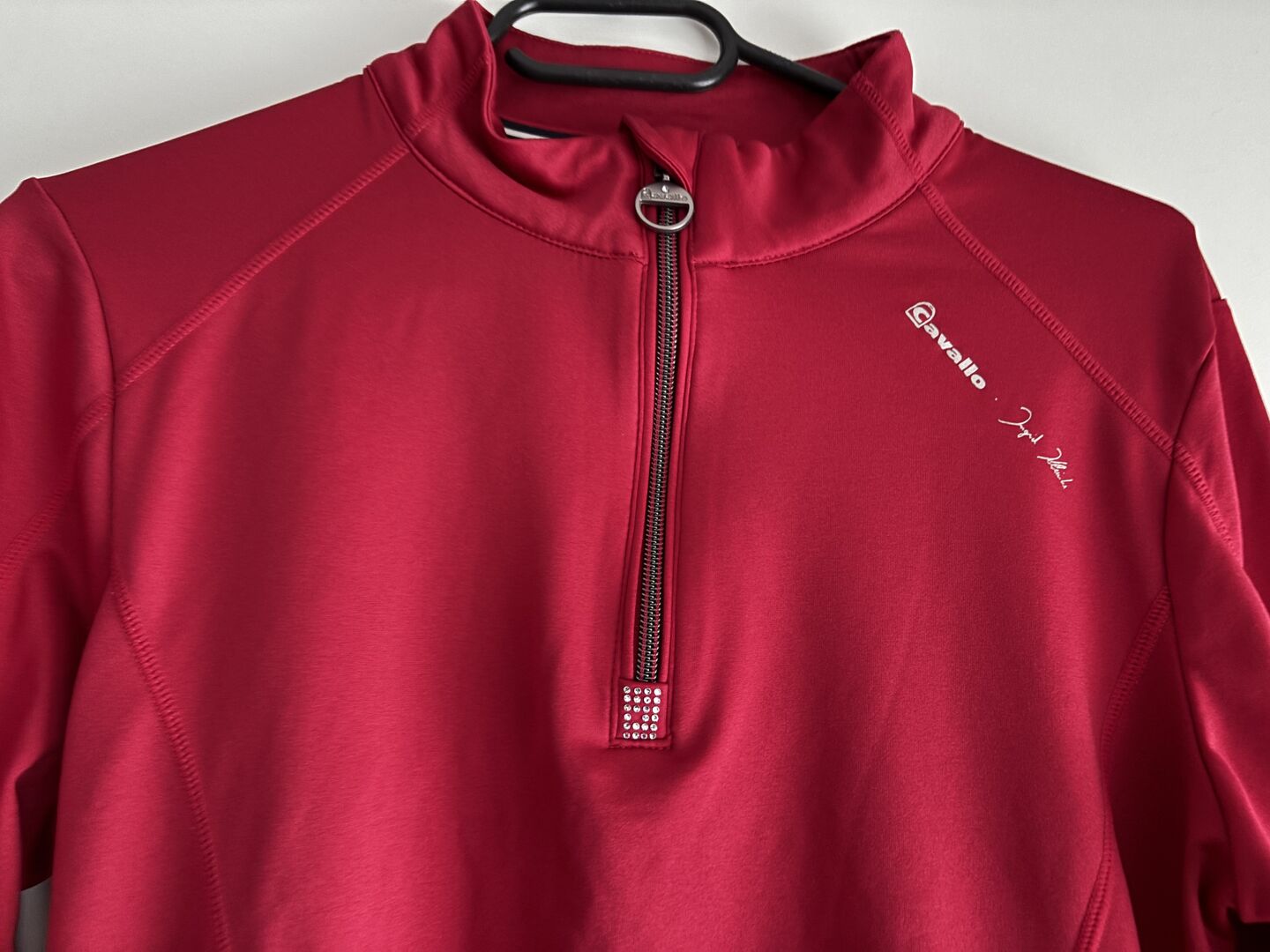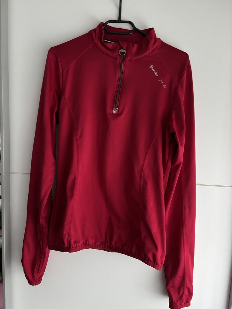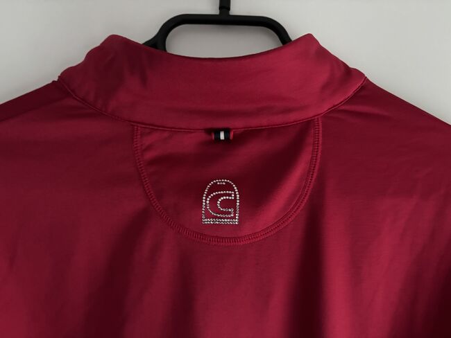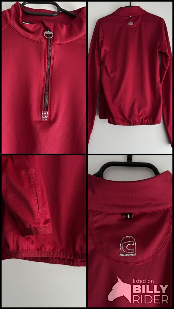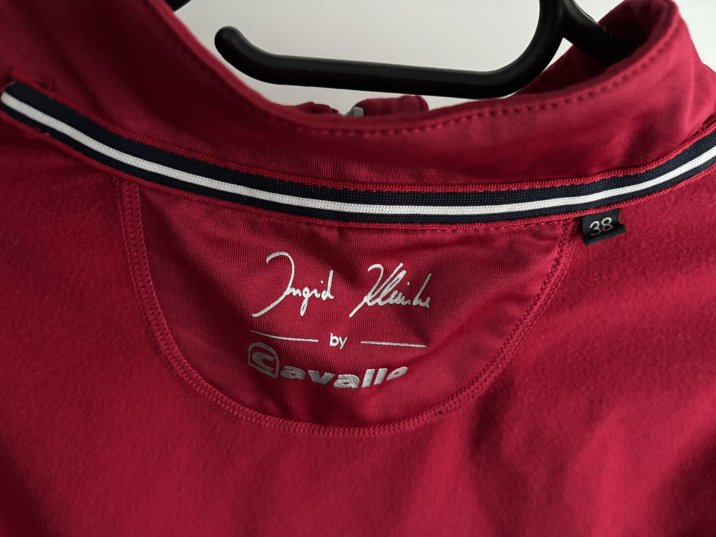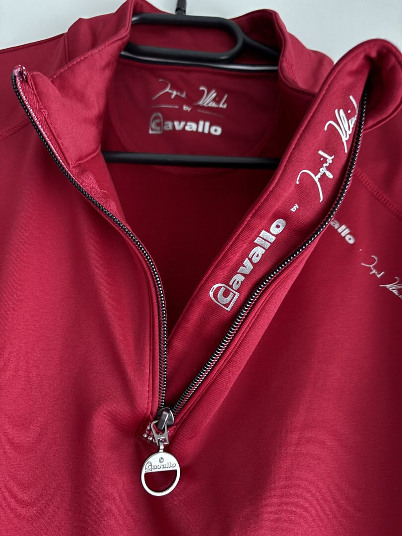 CAVALLO x INGRID KLIMKE funkcjonalna koszulka KOU rozmiar 38 RACE RED HW21 - Lekka koszula ze stójką wykonana z funkcjonalnego, bi-elastycznego materiału. Rozmiar 38 Bardzo dobry stan, rzadko noszona. Oryginalna cena 69,90€ Miękko szczotkowana wewnątrz dla wygodnego dopasowania. Zamek błyskawiczny na kołnierzu z ozdobnym uchwytem Cavallo i kryształem. Elegancka kryształowa aplikacja pod zamkiem. Brakuje jednego kryształu, kryształy zastępcze zostaną wysłane. Logo strzemion Cavallo wykonane z kryształków między ramionami. Dyskretna srebrna grafika Ingrid Klimke & Cavallo na lewym ramieniu.