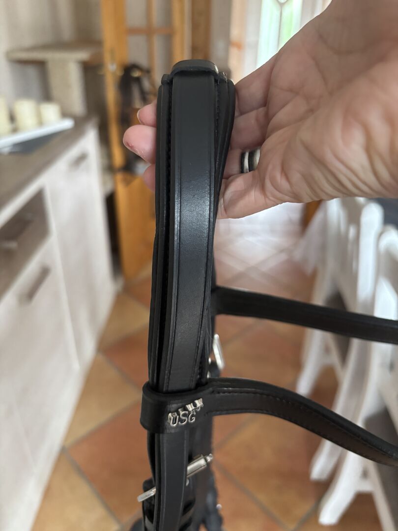 Cavesson z USG - Szelki do lonżowania i prowadzenia. Wykonany z czarnej skóry z białą podszewką w okolicy nosa, srebrne okucia. Łatwe dopasowanie dzięki wielu opcjom regulacji. Może być używany z wędzidłem lub bez.