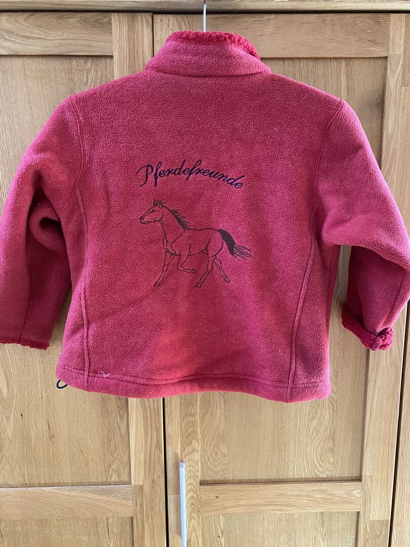 Ciemnoróżowa pluszowa kurtka dla małych dziewczynek w rozmiarze 116 - Ciepła ciemnoróżowa pluszowa kurtka w rozmiarze 116 z zamkiem błyskawicznym z przodu, elastycznym paskiem w talii i logo konia z tyłu. Dwie kieszenie na suwak z przodu