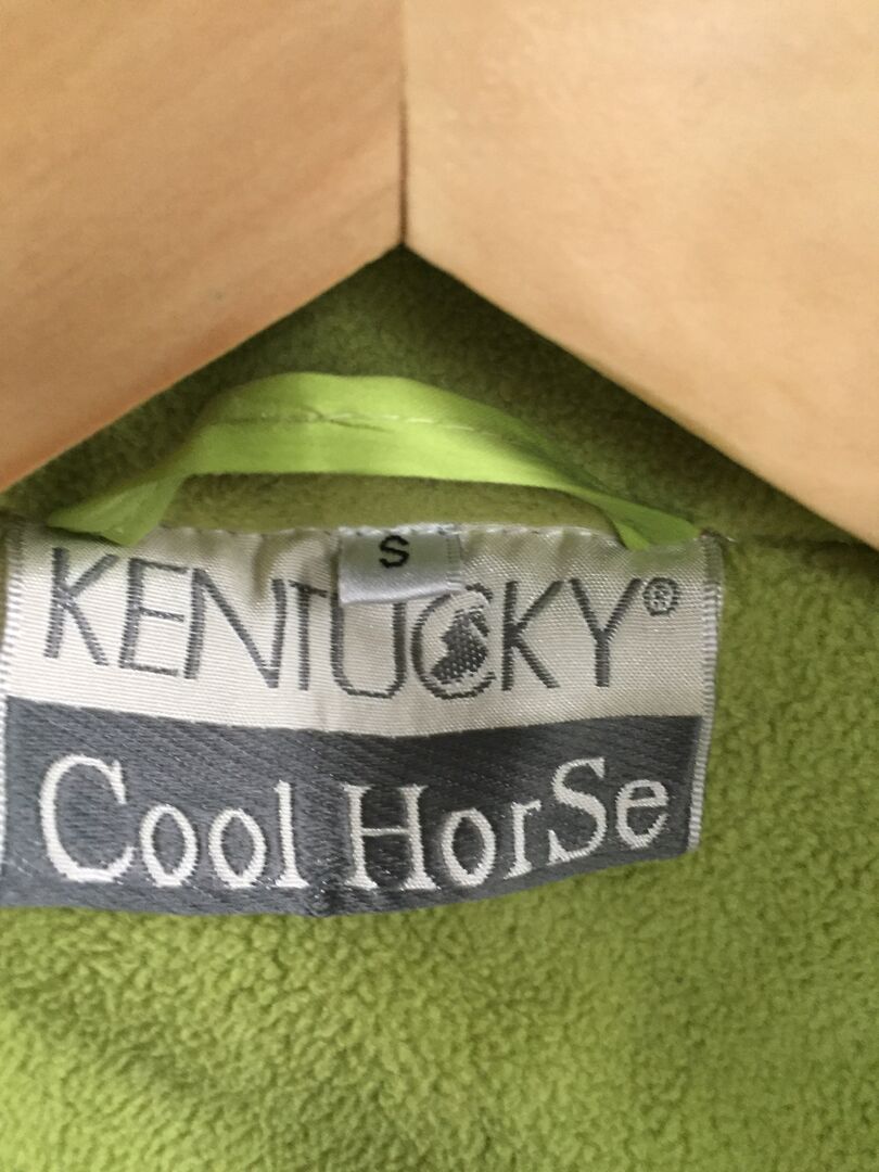 Ciepła kurtka Kentucky w rozmiarze S - Ciepła kurtka z polaru w rozmiarze S z kapturem, w efektownym zielonym kolorze z brązowymi kontrastowymi aplikacjami. Zamek błyskawiczny, mankiety, lewa strona. Emblemat na prawej piersi. Elastyczne mankiety i pasek w talii