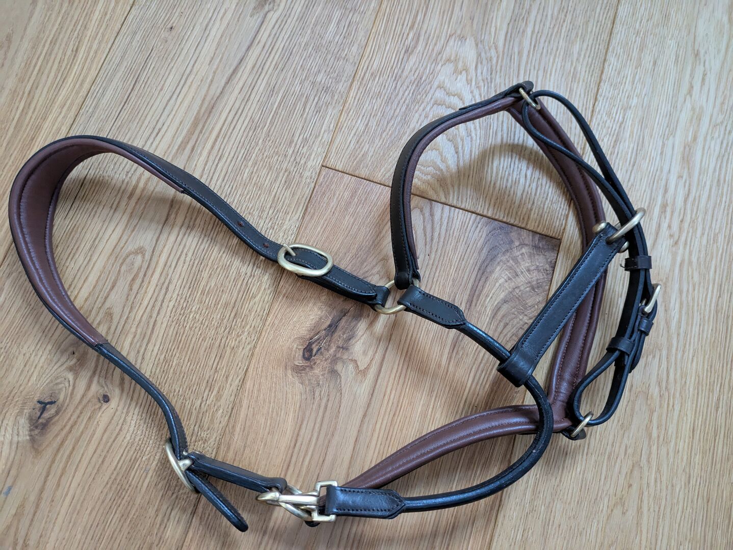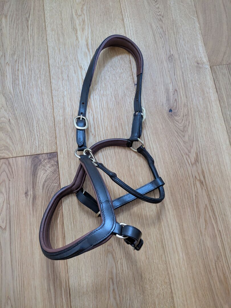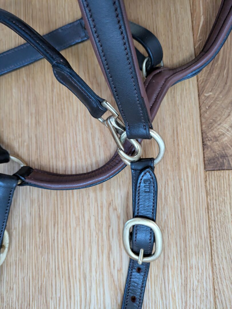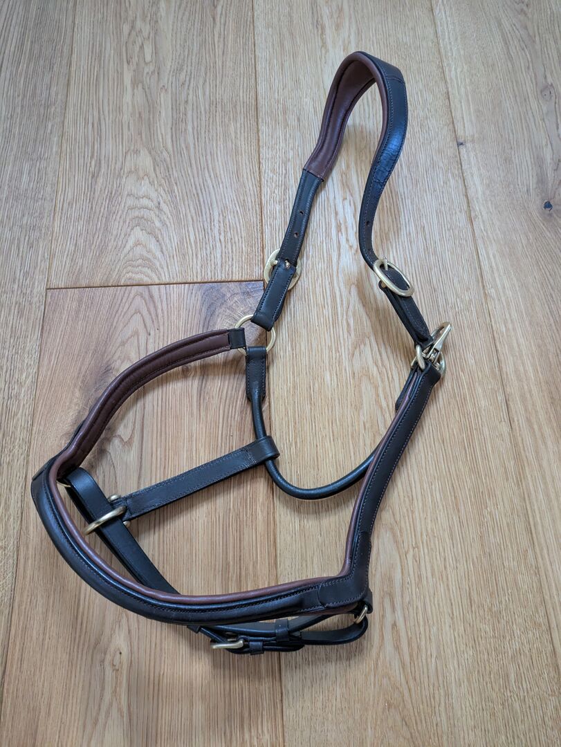 Claridgehouse Leather Halter Cob - Skórzany kantar marki Claridge House w kolorze brązowo-nugatowym, rozmiar Cob (może pasować również do koni rasy warmblood). Z mosiężnymi okuciami. Kupiony od Krämer i bardzo mało używany, skóra jest zadbana. Miękko podszyty naczółek i pasek na nos. Regulowany po obu stronach i może być zapinany na zatrzask. Nowa cena 39€